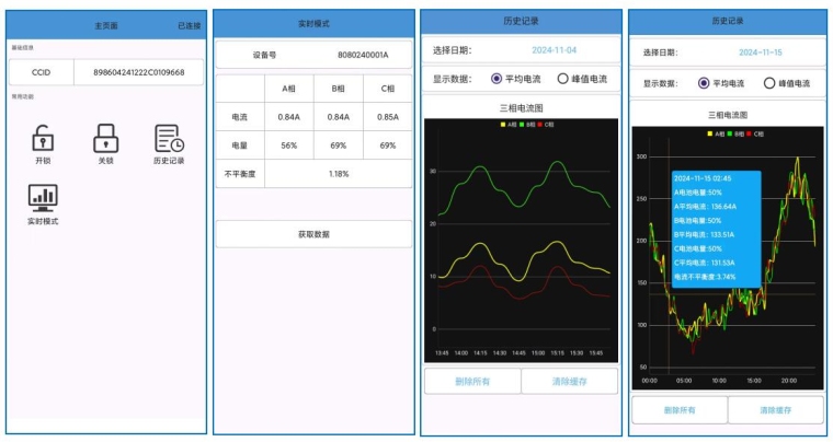 三、产品特点 1.监测装置通过多连接通信技术,实现装置之间、装置与手机、后台服务器的多连接通信。 2.监测仪可测量并记录三相电流的平均值、zui大值、zui小值、三相不平衡度等数据,展示三相电流随时间变化的趋势图。 3.通过手机蓝牙在现场或通过4G通信在后台远程设置装置编号、测试间隔时间等,查看装置编号、电池电量、三相负荷数据。 4.极低的运行功耗可保障仪器在现场较长时间的连续监测。 5.监测装置采用钳形结构无需断开被测线路,测试安荃快捷。 6.监测装置具有防水防尘功能,防护等级IP65。 7.监测装置具有防盗功能,内置电子锁,可连接蓝牙使用APP控制钳头的闭锁或开锁,可安装在户外使用。 8.监测装置内置大容量锂电池,超长续航时间。 9.监测装置配有充电座,一次可同时对3个监测仪进行充电。