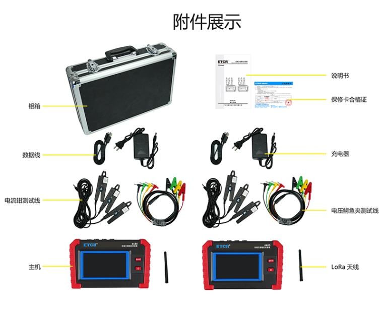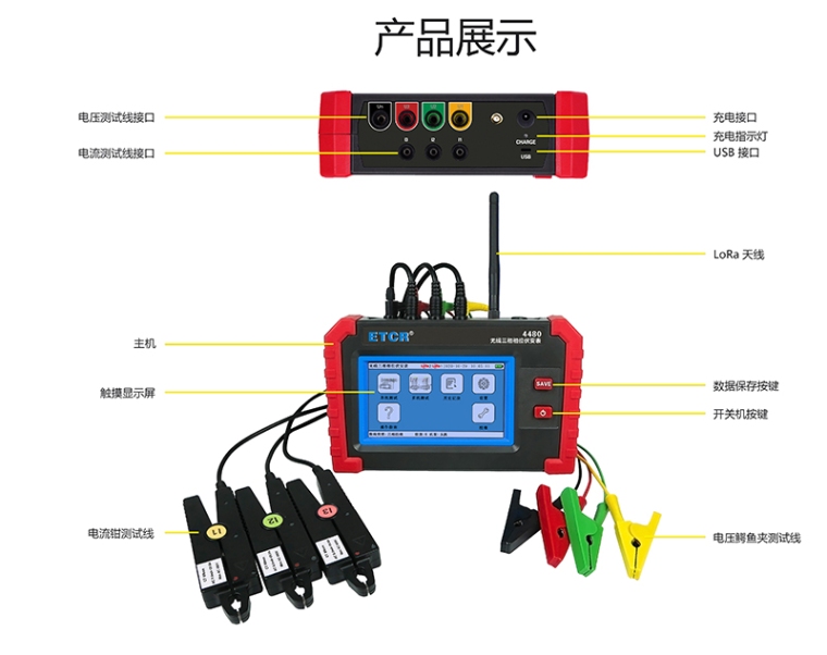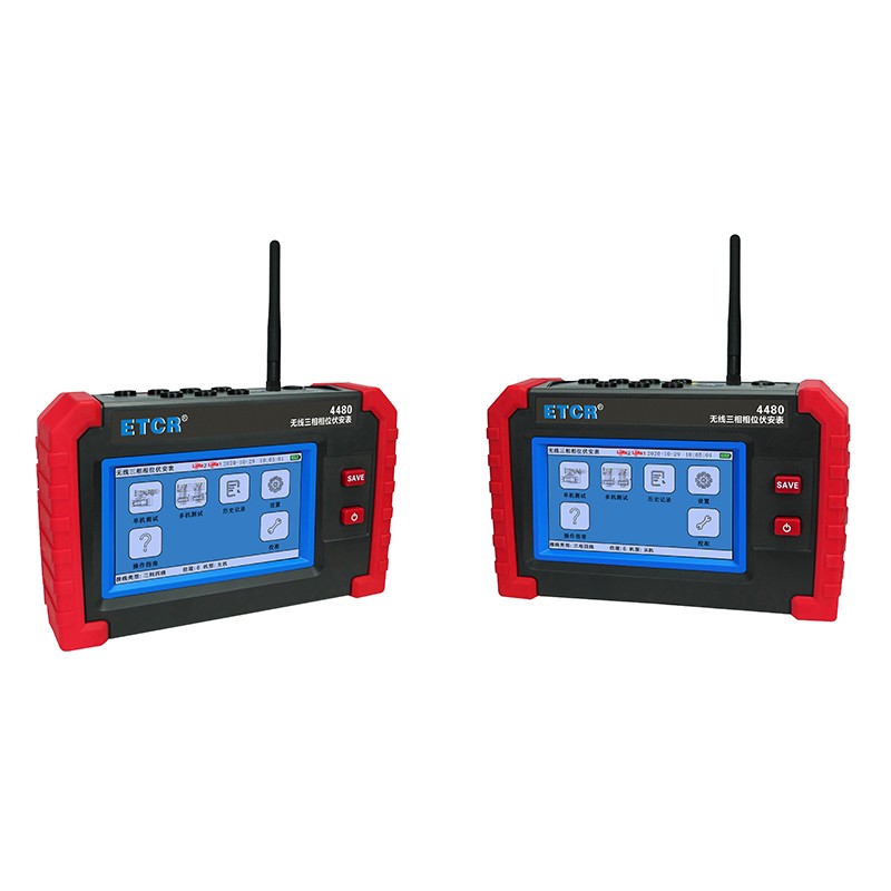 ,用于无线同步测量变电站二次回路中不同测量点的电压幅值、电流幅值、电压相位、电流相位、频率、功率等参数,还能够同屏显示主从机的三相电压和电流的矢量图。无需临时拉线,解决智能变电站中不同点电流电压无法测量的问题。仪表由2台手持测量终端组成,2台终端均可设为主机或从机。用户可同时使用3台或4台手持终端联机测试。产品操作简单、使用方便、测量快速、稳定、结果可靠。可广泛应用于智能变电站、常规变电站、电力部门、铁路部门、工矿企业、野外电工作业以及检测站等。 单台手持终端使用时,可作为三相相位伏安表使用,可以测量电流、电压、相位、功率、频率、功率因素等参数,并且能够实时显示三相电压和三相电流的矢量图。 两台手持终端同时使用时,可以同时测量六路电压幅值、电流幅值、电压电流相位等参数。两台终端通过无线通讯,能够实现联动设置接线类型、通信信道、时间设置等。测试现场时不需要在不同点拉设临时电缆,解决了传统的变电站内二次回路不同点测试时拉线工作量大的难题。彻底解决智能变电站中不同点电流电压无法测量的问题,无需断开被测电路,操作简单安荃实用。 采用5寸触摸彩屏、中文界面、功能直达、自动测量、操作简易快捷,准确可靠,同时仪表采用大容量可充电锂电池、具有数据存储、数据查阅、自动关机、USB数据上传导出等功能。由于本仪器采用专用计量芯片,所以本仪表具备非常高精度的电参数测量,能够实时显示待测参数的变化,同时具备一键保存数据的功能。 本仪器的具有如下功能及特点: 1. 触摸彩屏,中文界面,操作简易快捷; 2. 单机可作为三相伏安表使用; 3. 双机可作为无线相位伏安表使用,可在变电站的不同位置测试电流、电压、相位、功率、频率、功率因素等;具有单相或三相测试模式; 4. 用户可根据需要,同时使用3台或4台手持终端联机测试。 5. 测量人员只需进行接线操作,仪器便会自动测量,实时更新数据,便于现场分析; 6. 仪器采用完全隔离技术,避免安荃事故的发生; 7. 采用LORA无线通讯,传输距离远,可达1000m(在空旷场所) 。 一、量程与精度