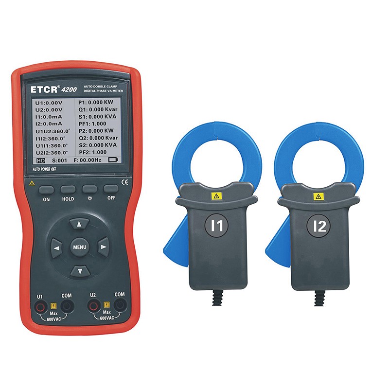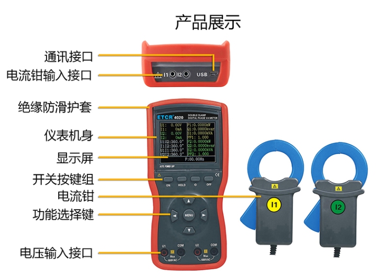 ETCR4020大口径双钳数字相位伏安表选用新型材料设计制作外壳模具,配有的防振、防滑、高绝缘护套,采用2.8寸TFT彩色液晶屏,所有参数同屏显示,一目了然,尽显精美豪华外观。仪表配有USB接口,可存储1200组数据,通过系统软件上传所存数据到电脑,实现在线实时监测与历史查询,动态显示,能读取、保存、报表、打印历史数据等。仪表采用大口径电流钳适用于粗大导线的检测,能满足不同场所需求。