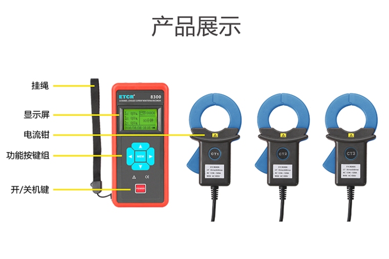 一.简介 ETCR8300系列三通道漏电流监控记录仪是为现场在线同时监测、记录1~3路交流电流或漏电流而精心设计制造,由记录仪主机、电流钳、充电器、监控软件、通讯线等组成,可广泛应用在380/220伏电力系统中,为用电检查人员提供**、准确、便捷的电力仪器。 主机采用LCD显示,三通道同屏显示,一目了然,有中文操作界面和英文操作界面两款选择,适合于不同国家的工程技术人员。记录仪采用大容量可充电锂电池,三格电量显示,续航Max可以持续记录7天。具有系统时钟功能和超大存储空间,能现场设定监测记录时间,能存储12000组数据,具有自动存储间隔时间设定功能,从1~99分钟内设置。 监控软件具有在线实时监控与历史查询功能,历史数据读取、查阅、保存、报表等功能。 电流钳选用坡莫合金制作,采用CT技术及独特的双层磁性屏蔽技术,几乎不受外界磁场影响,确保了常年无间断监测的高精度、高稳定性、高可靠性。 二.型号说明