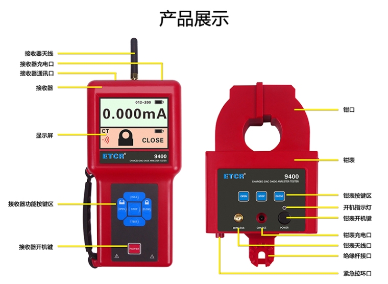 由主机、检测仪、绝缘杆组成。主机与检测仪采用无线通讯,通讯距离30米,主机可遥控检测仪钳头的张开或闭合完成测试过程,主机能实时显示电流测试值及钳头状况。检测仪采用微型马达驱动钳头的张开或闭合,钳头采用高性能坡莫合金制作,具有超强的抗干扰能力,分辨率高达1uA。检测仪可连接绝缘杆用于高压线路的绝缘子测试。仪表也可做高精度钳形电流表使用。