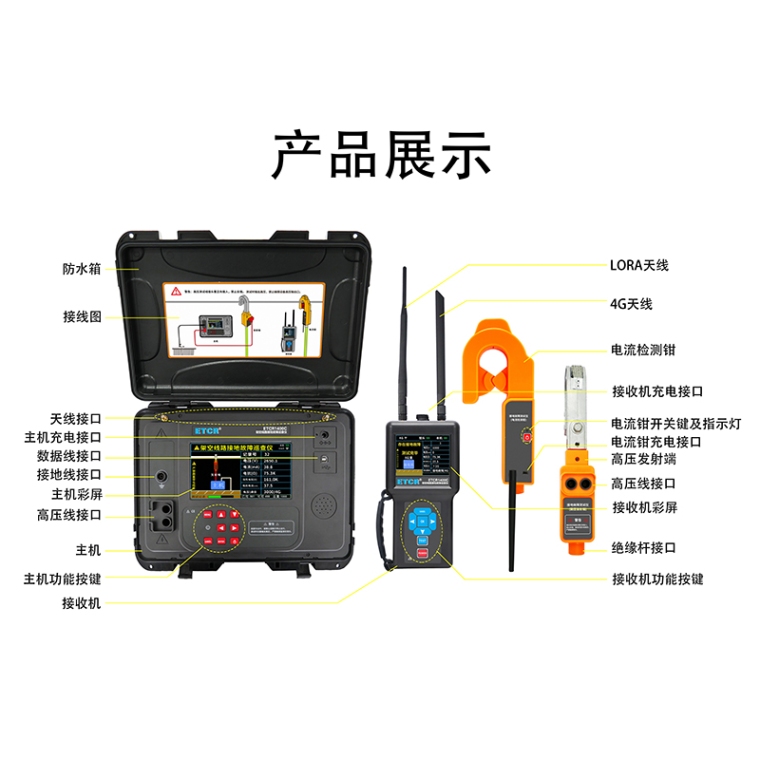 一、简介 ,是我公司精心研发的新型线路接地故障巡查装置,适用于不长于25公里的架空高压线路巡查单相接地故障,对接地故障点进行精准探寻定位(巡查作业时线路需停止运行)。仪器适用于裸导线或带绝缘外皮的导线,能准确找到架空线路的单相金属性接地、经电弧接地、经过渡电阻接地、瓷瓶击穿、避雷器击穿等隐蔽性接地故障。 ,由主机、电流检测钳、高压发射端、接收机、测试线、接地针、绝缘杆及附件组成。主机与接收器之间为4G/LORA双模通信,控制高压信号输出,同时将测试结果发出到主机。电流钳与接收器之间为LORA通信,将电流钳检测到的信号发送到接收器。主机采用7寸彩屏,故障指向清晰明了,测试结果一目了然,接收机具有语音播报功能,测试结果、线路故障方向,使得现场操作更加轻松。电流检测钳及高压发射端结构紧凑,体积小,重量轻,挂装方便,一次挂装即可完成线路故障查找,操作简易快速,极大减轻了测试的工作强度,提高工作效率。 ,可进行多条线路的接地故障定位。在架空线路停运后,由高压发射端向线路施加低频高压信号,电流检测钳检测电缆线的信号,通过主机分析脉冲电流及阻抗,判断有无接地故障,在接收机液晶屏显示及语音播报检测结果。 二、功能特点 1. 能准确判断出接地故障的方向及测量接地故障电阻值,无需断开PT,测试便捷快速。 2. 可应用于带绝缘外皮的电缆线(高压发射端挂在验电环上)。 3. 适用于检测架空线路的单相金属性接地、经电弧接地、经过渡电阻接地、瓷瓶击穿、避雷器击穿等隐蔽性多种故障。 4. 输出电压有8000V及3000V两档选择,输出电流≤100mA。 5. 短路检测能力强,可检测接地电阻为0Ω的直接短路故障。 6. 无需另配外置电源,充满电后可持续工作10小时,可检测整条线路。 7. 语音播报功能,播报检测结果。 8. 主机与接收器间采用4G、LoRa双模通信。 三、技术规格