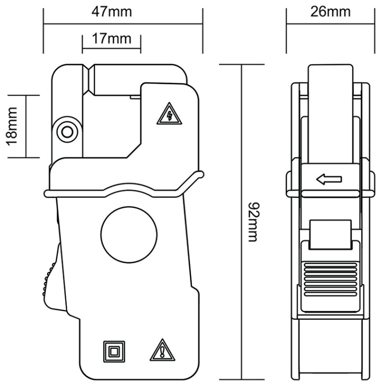 产品功能 交流漏电流、电流、高次谐波电流、相位、电能、功率、功率因数等检测。 产品特点 1. 钳形结构,不必断开被测线路,携带方便特别适合现场在线测试。 2. 非接触测量,操作方便快速**可靠。 3. 采用坡莫合金铁芯,性能稳定精度高,抗干扰能力强,适用于复杂的干扰环境。 4. 传感器的量程、变比、输出接口等可按客户要求订制。 5. 输出接口:φ3.5mm音频插头/BNC插头/4.0mm双香蕉插头(选购),线长2m。 6. 绝缘强度:AC 3700V/rms(铁芯与外壳之间)。 7. 外形尺寸:47mm×92mm×26mm 8. 钳口尺寸:17mm×18mm 9. 质 量:175g 10. **等级:CATⅢ600V。 11. 工作温度:-15°C~50°C 技术规格