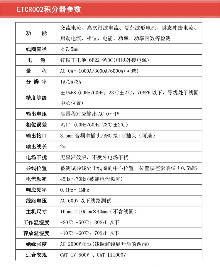 柔性线圈罗氏线圈电流传感器积分器技术规格 功 能 | 交流电流、高次谐波电流、复杂波形电流、瞬态冲击电流、启动电流、相位、电能、功率、功率因数等检测 | 线圈直径 | φ7.5mm | 电 源 | 锌锰干电池 6F22 9VDC(可以外接电源) | 量 程 | AC 0A~1000A/3000A/6000A(可选) | 分 辨 率 | 1A/2A/3A | 精度等级 | ±1%FS (50Hz/60Hz;23℃±2℃,70%RH以下,导线处于线圈中心位置) | 输出电压 | 满量程对应输出AC 0~1V | 相位误差 | ≤1°(50Hz/60Hz;23℃±2℃) | 输出接口 | 3.5mm音频率插头/BNC接口/抽头(可选) | 输出线长 | 2m | 电场干扰 | 无磁滞效应,不受外电场干扰 | 导线位置 | 被测试导线处于线圈的中心位置,位置误差影响≤±0.5%FS | 电流频率 | 45Hz~70Hz(被测电流频率) | 响应频率 | 0.1Hz~1MHz | 线路电压 | AC 600V以下线路测试 | 主机尺寸 | 165mm×105mm×40mm(不含线圈) | 工作温湿度 | -20℃~50℃;80%rh以下 | 存放温湿度 | -10℃~60℃;70%rh以下 | 绝缘强度 | AC 2000V/rms(线圈解锁展开后的两端) | 适合安规 | CAT IV 500V 、CATⅢ1000V |