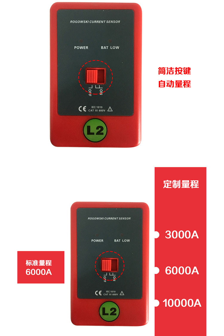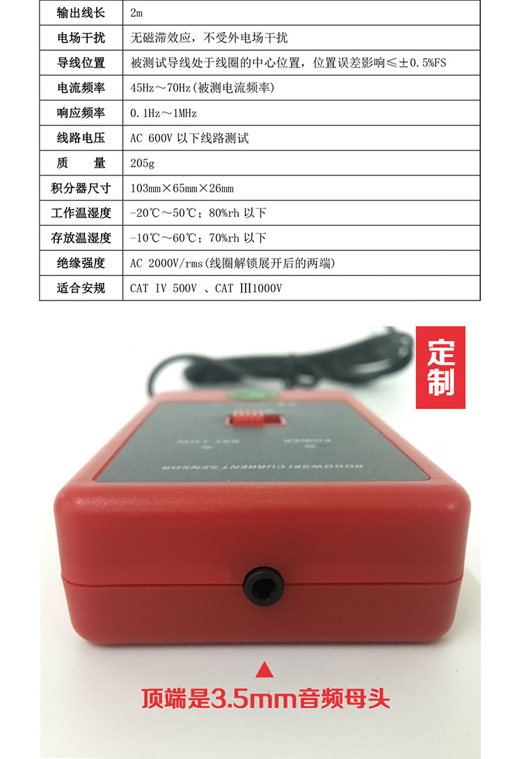 技术规格 功 能 | 交流电流、高次谐波电流、复杂波形电流、瞬态冲击电流、启动电流、相位、电能、功率、功率因数等检测 | 电 源 | 锌锰干电池 6F22 9VDC(可以外接电源) | 量 程 | AC 0A~3000A/6000/10000A(可选) | 分 辨 率 | 1A/2A/3A | 精度等级 | ±1%FS (50Hz/60Hz;23℃±2℃,70%RH以下,导线处于线圈中心位置) | 信号输出 | 满量程对应输出AC 0~1V | 相位误差 | ≤1°(50Hz/60Hz;23℃±2℃) | 输出接口 | 3.5mm音频率插头/BNC接口/抽头(可选) | 输出线长 | 2m | 电场干扰 | 无磁滞效应,不受外电场干扰 | 导线位置 | 被测试导线处于线圈的中心位置,位置误差影响≤±0.5%FS | 电流频率 | 45Hz~70Hz(被测电流频率) | 响应频率 | 0.1Hz~1MHz | 线路电压 | AC 600V以下线路测试 | 质 量 | 205g | 积分器尺寸 | 103mm×65mm×26mm | 工作温湿度 | -20℃~50℃;80%rh以下 | 存放温湿度 | -10℃~60℃;70%rh以下 | 绝缘强度 | AC 2000V/rms(线圈解锁展开后的两端) | 适合安规 | CAT IV 500V 、CAT Ⅲ1000V |