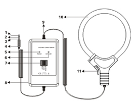 3.屏蔽地 4.积分器信号输出音频插头 5.积分器电源指示灯 6.积分器电池电压低指示灯 7.电源/档位开关 8.积分器 9.柔性线圈接口 10.柔性线圈 11.锁扣 彩图说明: