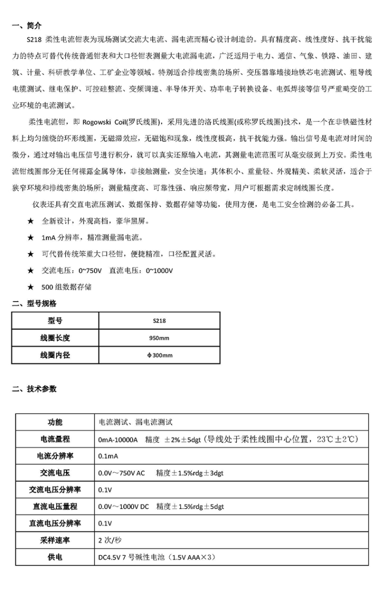 我对您的柔性钳形电流表S218产品感兴趣,请发具体的信息及报价,谢谢!