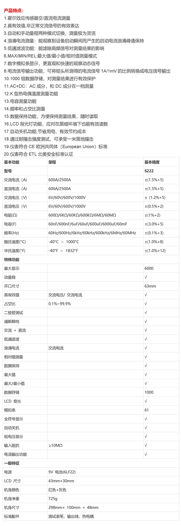 我对您的钳形万用表S222产品感兴趣,请发具体的信息及报价,谢谢!
