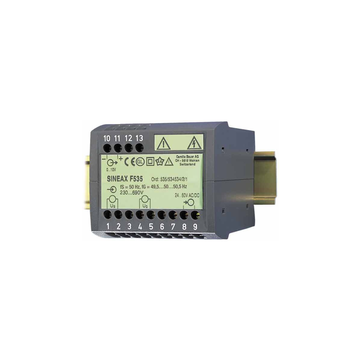单功能频率变送器SINEAX F535可用于获取两个同步系统的频差,测定作为同步控制变量的频差。 产品特点 ▪ 测定作为同步控制变量的频差 ▪ 德国劳埃德船级社标准,适用于船舶 ▪ 输出信号可用于指示,注册,监测和控制 ▪ 通过电流隔离和防震终端(IP20)保证安全性 技术数据 ▪ 测量输入: 输入标称电压 10...230V或230V...690V ▪ 测量范围:fS = 50 Hz: fG = 49.5…50…50.5 Hz, fG = 47.5…50…52.5 Hz, fG = 47.5…50…52.5 Hz, fG = 40…50…60 Hz, fS = 60 Hz: fG = 57.5…60…62.5 Hz或用户自定义在10至1500Hz之间 [fS = 频率母线,FG = 频率发生器] ▪ 测量输出: 最大输出值0...20mA,4...20mA,0...10V或用户自定义在1...20mA或1...10V范围内,输出信号单极,对称双极或过零,设置时间可选输入频率的2,4,8或16周期 ▪ 精度: 等级0.2在15...30℃内 ▪ 供电电源: 24-60V AC/DC或85-230V AC/DC(也可从内部的测量输入),24V AC/24-60V DC,通过低电压侧连接 ▪ 外形尺寸:69.1 x 70 x 112.5 mm,,顶帽式导轨安装(35x15mm或35x7.5mm) 应用 电压,相位和频率平衡时将发生器并联到同一母线上的前提条件。频差的测定是通过同步测量母线电压和发生器电压获得。SINEAX F535变送器同样适用于基本波占主导地位的失真电压,并输出和测量频差成比例的直流信号。 |