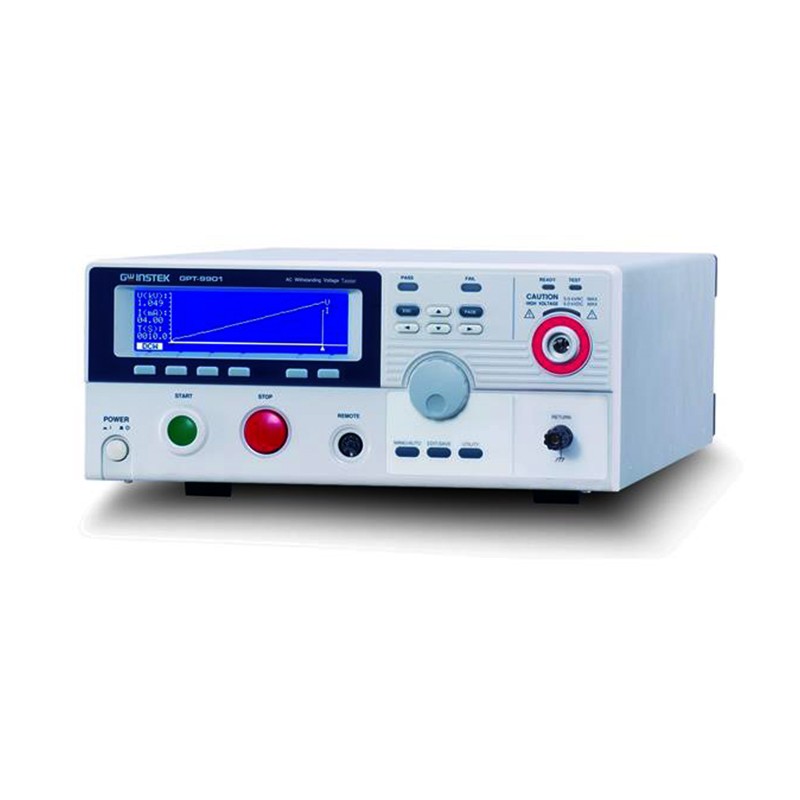 GPT-9900系列安规测试仪共计有2个型号: GPT-9904是4合一机种,具有交/直流耐压测试、绝缘电阻测试及交流接地阻抗测试功能、 GPT-9903/9903A提供交/直流耐压测试及绝缘电阻测试功能、 GPT-9902A提供交/直流耐压测试测试功能、 GPT-9901A提供交流耐压测试功能。全系列机型提供交流500VA输出容量,并使用高效率的PWM放大器,有效避免因输入电源电压变动或波形变形的影响,以确保交流耐压测试时对待测物提供稳定之高压输出。