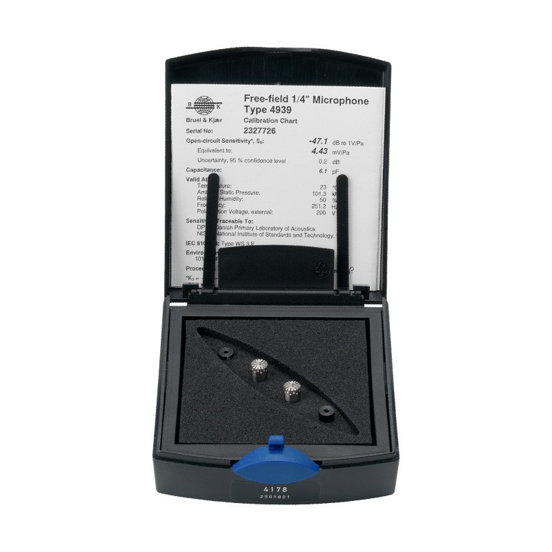4939型传声器是专门为高声级和高频率测量设计的。通过使用不锈钢振膜和保护格栅,传声器经过优化可承受恶劣环境,并能够在高达150°C(302°F)的高温下工作。传声器主要用于声强探头中测量声强,也可用于粒子速度测量。 其他用途包括测量声源的体积速度,例如用在4295型OmniSource™全向声源上的Brüel & Kjær 4299型体积速度适配器上。 4178型配备了6 mm和12 mm垫片及校准图表,为每个传声器提供各自测量的自由场频率响应以及相位响应对比校准图(100 Hz ~ 20 kHz)。 校准 4178型1/4英寸传声器对的相位校准,Brüel & Kjær使用的方法是在压力耦合器中使两个传声器接收相同的声音信号。这种独立的相位校准可用于推导出传声器对的声压-残余声强指数。 包含声强探头组的声强测量系统可以方便地使用3541型声强校准器进行校准。 这允许处理器的两个通道(测量声压、粒子速度或强度)同时进行灵敏度调节,并能得到探头和处理器组合的20 Hz ~ 5 kHz声压-残余声强指数。 技术参数
