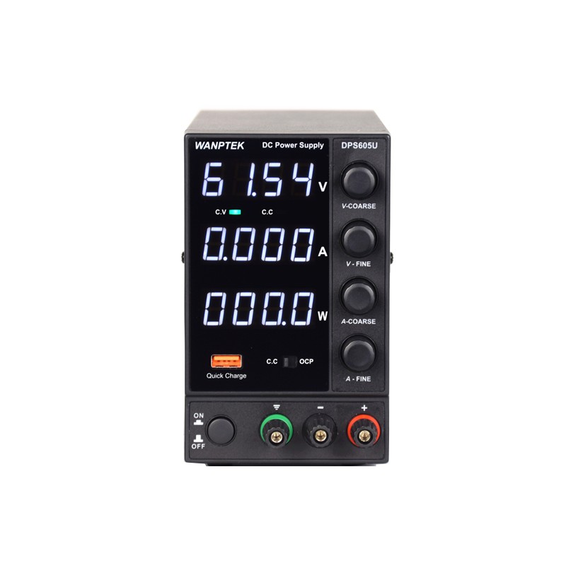 DPS605U是一款三窗口四位显示高精度开关型直流稳压电源,可同时显示电压、电流、功率。产品广泛用于手机维修、电脑维修、学校和生产线的使用,其输出电压和输出电流均可在0和标称值之间连续可调。电源的稳定度和纹波系数都非常好,具有USB快充功能和**的短路保护电路。其体积小、设计美观、操作便捷、可以满负荷长时间工作,深受广大用户喜爱。 产品特性 USB快充功能,支持多种快充协议。 短路保护功能,短路停止输出。 体积小、重量轻、功率密度高。 恒压,恒流自动切换。 电压、电流、功率 三LED显示,精度高。 温控风扇散热、噪音低、寿命长。 应用领域 生产线测试。 手机,电脑,电器维修。 产品老化,电镀。 蓄电池充电。 实验室、科研教学。 其它一切需要直流稳压电源的场合。 技术参数 产品型号 | DPS305U | DPS3010U | DPS605U | 输出功率 | 150W | 300W | 300W | 输出电压 | 0~30V | 0~30V | 0~60V | 输出电流 | 0~5A | 0~10A | 0~5A | 辅助功能 | USB快充,支持多种快充协议 | 保护方式 | 限流保护/短路报警停止输出、自恢复 | 工作环境 | | 输入电源:AC 230V/115V±10%;50Hz/60Hz | 工作温度:0℃~40℃;相对湿度:<80%RH | 存储温度:-10℃~70℃;相对湿度:<70%RH | 稳压状态CV | | 电压稳定度:0.1%±3mV | 负载稳定度: 0.2%±3mV | 纹波电压:≤0.5% Vp-p | 0至额定电压连续可调 | 稳流状态CC | | 电流稳定度:0.1%±3mA | 负载稳定度: 0.2%±3mA | 纹波电流:≤0.5% Vp-p | 恢复时间:≤500μS | 温度系数:≤100ppm/℃ | 0至额定电流连续可调 | 表头显示 | | 0.56寸白光四位数码管显示 | 显示精度:0.5%±3个字 | 显示分辨率:电压0.01V, 电流0.001A | 产品特征 | | 产品尺寸:长225mm X 宽90mm X 高145mm | 包装尺寸:140(宽) x 200(高) x 300(长) mm | 裸机重量:1.6Kg | 含包装配件重量:1.8Kg | 8台/整件,整箱尺寸:59*32*43cm,整箱重量:15Kg | 随机附件 | | AC电源线 x 1,(可选:国标,美标,欧标,英标等) | 操作手册 x 1, | 输出测试线 x 1, | 机身颜色 | 黑色 |