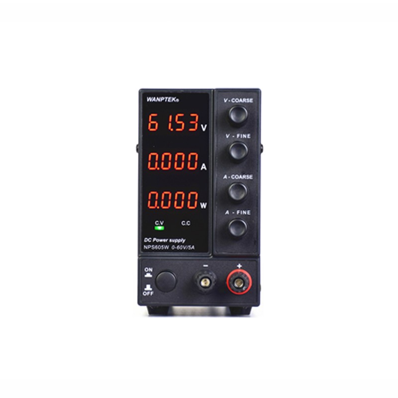 固测电子新推出的NPS-W系列产品,含有4款型号,分别是NPS306W,NPS3010W,NPS605W,NPS1203W,机身颜色有黑色和灰白色选择。该机型是属于迷你型开关式直流电源供应器,产品改善了传统线性式电源供应器体积大、重量重、和效率差的缺点。输出电压与电流,可分别由可变电阻器来控制调整,所以在电压、电流的调整上提供了更加的便利性与精准性。面板上同时提供了电压,电流,功率三窗口数码管高精度显示,使用户可以直观的看到机器当前的使用状态和各项参数。 产品特性 两款机身颜色,用户的个性选择。 体积小、重量轻、功率密度高。 恒压,恒流自动切换。 电压、电流、功率 三LED四位显示,精度高 温控风扇散热、噪音低、寿命长。 应用领域 生产线测试。 手机,电脑,电器维修。 产品老化,电镀。 蓄电池充电。 实验室、科研教学。 其它一切需要直流稳压电源的场合。 技术参数 产品型号 | NPS306W | NPS3010W | NPS605W | NPS1203W | 输出功率 | 180W | 300W | 300W | 360W | 输出电压 | 0~30V | 0~30V | 0~60V | 0~120V | 输出电流 | 0~6A | 0~10A | 0~5A | 0~3A | 工作环境 | | 输入电源:AC 230V/115V±10%;50Hz/60Hz | 工作温度:0℃~40℃;相对湿度:<80%RH | 存储温度:-10℃~70℃;相对湿度:<70%RH | 稳压状态CV | | 电压稳定度:0.1%±3mV | 负载稳定度: 0.2%±3mV | 纹波电压:≤0.5% Vp-p | 0至额定电压连续可调 | 稳流状态CC | | 电流稳定度:0.1%±3mA | 负载稳定度: 0.2%±3mA | 纹波电流:≤0.5% Vp-p | 恢复时间:≤500μS | 温度系数:≤100ppm/℃ | 0至额定电流连续可调 | 表头显示 | | 0.4寸红色四位数码管显示 | 显示精度:0.5%±3个字 | 显示分辨率:电压0.01V, 电流0.001A | 产品特征 | | 产品尺寸:70(宽) x 130(高) x 230(长) mm | 包装尺寸:110(宽) x 170(高) x 290(长) mm | 裸机重量:1.3Kg | 含包装配件重量:1.6Kg | 10台/整件,整箱尺寸:54*31*38cm,整箱重量:16.2Kg | 随机附件 | | 国标电源线 x 1,(可选:美标,欧标,英规...) | 操作手册 x 1, | 输出测试线 x 1, | 机身颜色 | 黑色 |