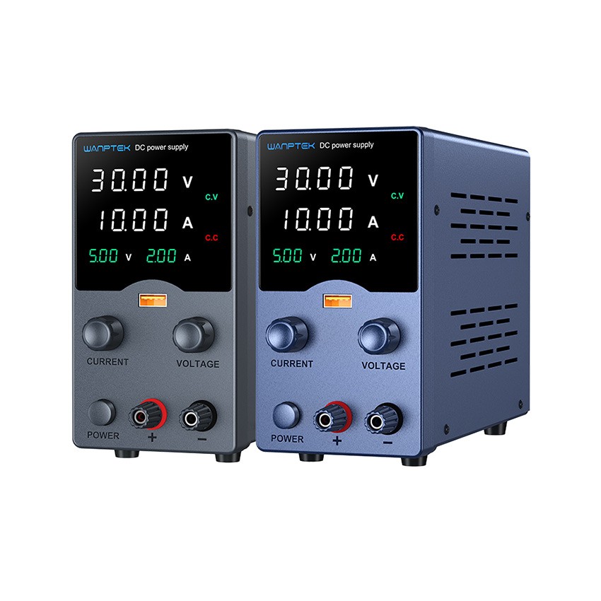 GA系列产品是四窗口双色数显开关直流稳压电源,带有USB快充输出显示,可同时显示电压和电流。产品广泛应用于手机维修、电脑维修、电池充电、学校教学和生产线使用。GA系列产品使用编码电位器可以在0和标称值之间连续调节输出电压和输出电流,可以预先显示设定值,方便使用和调节。本机具有USB快速充电接口带输出显示,支持多种快速充电协议。具有**的短路保护电路。电源的稳定性和纹波系数都非常好,其体积小、重量轻、设计美观、操作方便,满负荷可长时间工作,深受用户喜爱。 产品特点 应用领域 1.生产线测试。 2.修理手机、电脑、电器。 3.产品老化和电镀。 4.电池充电。 5.实验室、科研和教学。 6.所有其它需要直流稳压电源的场合。 产品列表 产品型号 | GA305H/L | GA3010H/L | GA605H/L | GA1203H/L | GA1602H/L | 输出功率 | 160W | 320W | 310W | 360W | 320W | 输出电压 | 0~32V | 0~32V | 0~62V | 0~120V | 0~160V | 输出电流 | 0~5A | 0~10A | 0~5A | 0~3A | 0~2A | 辅助功能 | USB快充输出带显示,支持多种快充协议。 | 保护方式 | 过压保护、过流保护、过温保护。 | 工作环境 | | 输入电源:AC 230V/115V±10%;50Hz/60Hz | 工作温度:0℃~40℃;相对湿度:<80%RH | 存储温度:-10℃~70℃;相对湿度:<70%RH | 稳压状态CV | | 电压稳定度:0.5%±3mV | 负载稳定度: 0.5%±3mV | 纹波电压:≤0.5% Vp-p | 0至额定电压连续可调 | 稳流状态CC | | 电流稳定度:0.5%±3mA | 负载稳定度: 0.5%±3mA | 纹波电流:≤0.5% Vp-p | 恢复时间:≤500μS | 温度系数:≤100ppm/℃ | 0至额定电流连续可调 | 表头显示 | | 0.4寸白光四位数码管两组显示;0.25寸绿光三位数码管两组显示。 | 显示精度:0.5%±5个字 | 显示分辨率:电压00.01V, 电流0.001A / USB: 电压0.01V, 电流0.01A | 产品特征 | | 产品尺寸:190mm(长) X 80mm(宽) X 145mm(高) | 包装尺寸:270(长) x 116(宽) x 195(高) mm | 裸机重量:1.15Kg | 含包装配件重量:1.5Kg | 8台/整件,整箱尺寸:500*285*432mm,整箱重量:12.75Kg | 随机附件 | | AC电源线 x 1,(可选:国标,美标,欧标,英标等) | 操作手册 x 1, | 输出测试线 x 1, | 机身颜色 | L(蓝色)、H(黑色)、B(白色) |