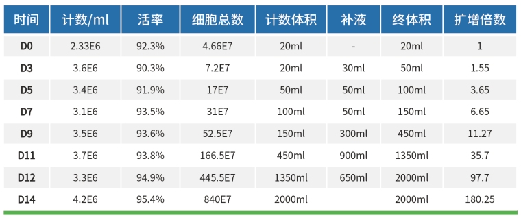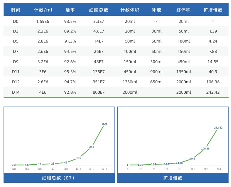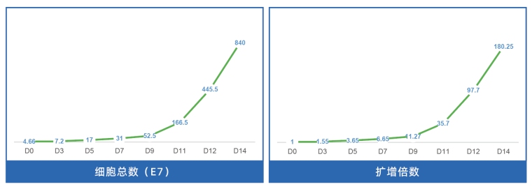 **代 γδT细胞试剂盒:抗体激活方案 pureSep-γδT纯化试剂从全血中高效快速去除αβT细胞,通过密度梯度负选原理实现高纯度γδT细胞富集,为γδ T细胞的超高纯度扩增奠定基础。后续采用抗体激活方案,同时扩增Vδ2细胞和部分Vδ1细胞,同时保持高纯度和功能完整性。 全程纯因子配方,无需引入化学试剂刺激,培养至d7纯度超过90%,d14纯度超过98%,非常适合大规模异体γδT细胞临床应用。 培养前的γδT细胞的富集,确保了不同供者间稳定的扩增效果,有效解决了原代细胞扩增中常见的供者个体差异性问题,为研究的可重复性提供了有利保障。 **代kit因为引入了pureSep-γδT纯化试剂,适用于新鲜的外周血或脐带血。 γδT细胞培养照片