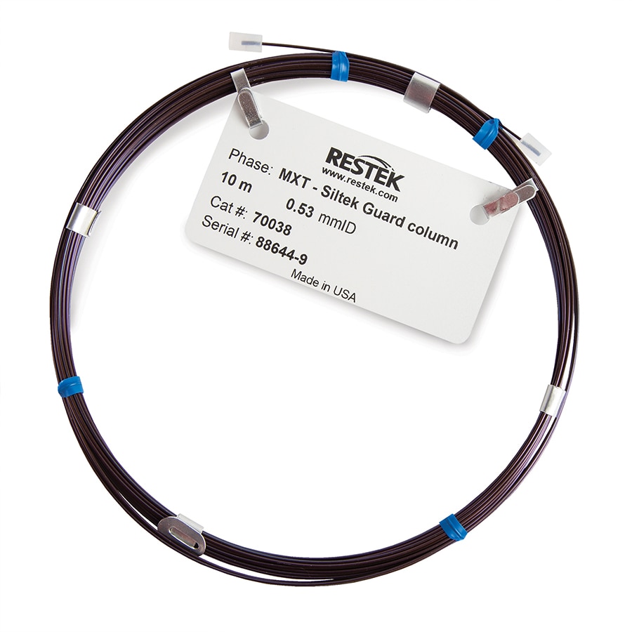 Guard columns and retention gaps are widely used in gas chromatography for different reasons. A guard column traps nonvolatile material at the head of the column, not allowing it to reach the analytical column, protecting it. A retention gap helps focus the compounds transferred from the inlet as a small band at the head of the analytical column to minimize chromatographic peak broadening. Siltek-treated, stainless-steel MXT guard columns provide excellent compatibility with MXT analytical columns while offering the strength of metal with the inertness of glass. These guard columns can also function as retention gaps. To discover how to connect an MXT guard column or retention gap (deactivated tubing) to an analytical column using an MXT low dead-volume connector, see the MXT Low Dead Volume Connectors for Use with Fused Silica Capillary Columns installation instructions.