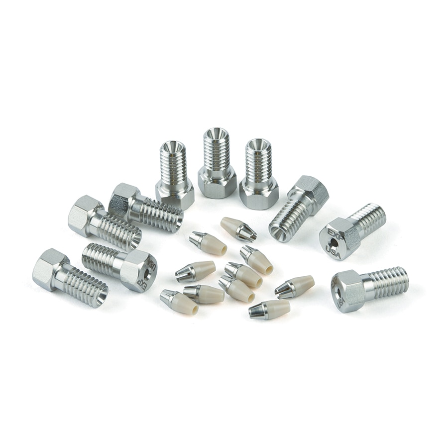 Restek is pleased to offer the reusable EXP fitting system from Optimize Technologies for the ultimate in easy, reliable LC connections! The patented hybrid EXP ferrule combines the durability of titanium with the sealing ability of PEEK for a swage that can be reused over and over again. And, when you choose the hand-tight fitting style, the special EXP nut offers an effortless seal up to 8700+ psi (600+ bar)—no tools needed! For a reliable 20,000+ psi (1400+ bar) UHPLC connection with either fitting style, simply wrench tighten an extra 1/4 to 1/2 turn. EXP ferrules should only be used with genuine EXP nuts. When used with an EXP nut, the EXP ferrule provides repeated ZDV (zero dead volume) connections to any 10-32 female threaded port, including Restek LC columns, 6-port injection valves, and more. To accommodate varying port depths, simply hold the tubing fully bottomed in the port and tighten as instructed. WARNING: Do not use EXP ferrules with standard nuts. Failure to use EXP fittings according to the included instructions may result in unsafe UHPLC connections and/or non-ZDV connections. Intellectual Property: optimizetech.com/patents 特点与优势