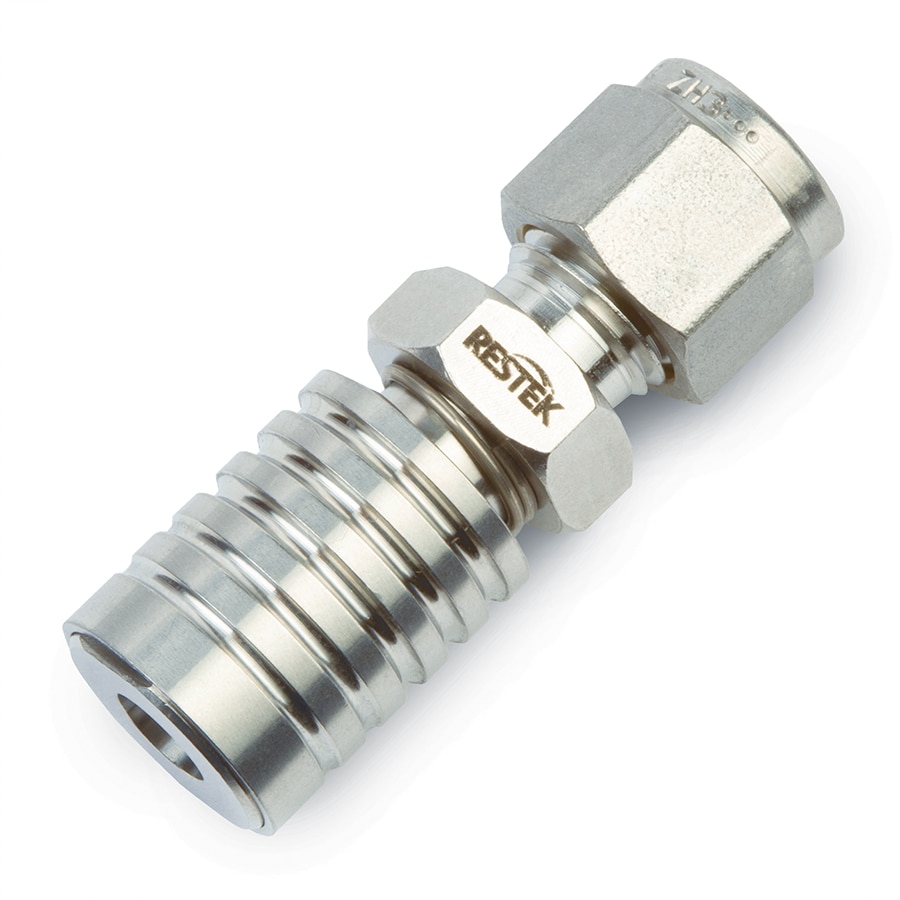 Note: A RAVEqc valve bracket is required for use with Restek 1, 3, 6, and 15 L air sampling canisters when using the compression fitting mounted directly on the 1/4" canister tube stub. This bracket is not needed when using Restek miniature canisters or Entech canisters.