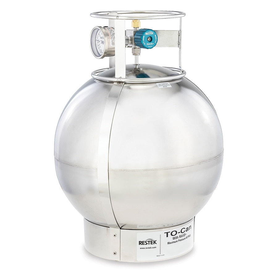U.S. EPA Methods TO-14A and TO-15A regulate the collection, storage, and analysis of volatile organic compounds (VOCs) using treated air sampling canisters. Restek offers a complete line of TO-Can canisters (SUMMA can equivalent) electropolished using a proprietary process and extensively cleaned using an ultrasonic method. This ensures a high-quality, passivated surface that maintains the stability of TO-14A/TO-15/TO-15A compounds during storage. A frame surrounds the electropolished canister, eliminating the need for weld marks on the sphere, thereby preventing active sites on the canister. The high-performance valve supports the excellent quality of the canister. A unique holder attaches the handle and base to the canister without welds and protects the canister, tube stub, and valve. The valve is an exceptionally high-quality, metal-to-metal seal, 2/3-turn valve with metal diaphragms to prevent sample adsorption for more accurate results. Each canister is slightly pressurized with contaminant-free nitrogen prior to shipment. Dimensions/Weights of Air Canisters