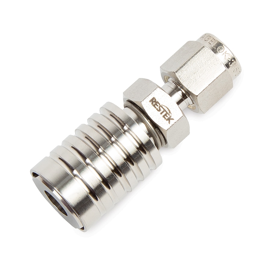 Note: A RAVEqc valve bracket is required for use with Restek 1, 3, 6, and 15 L air sampling canisters when using the compression fitting mounted directly on the 1/4" canister tube stub. This bracket is not needed when using Restek miniature canisters or Entech canisters.