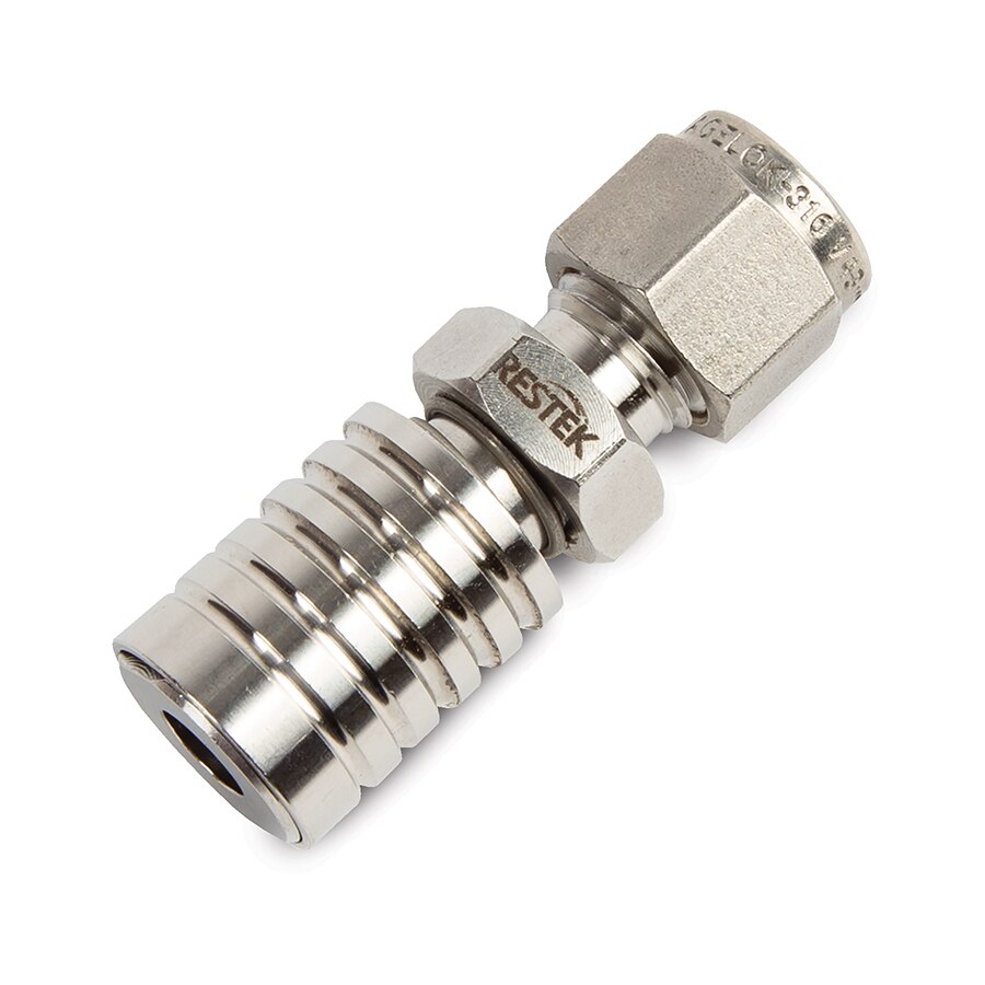 Note: A RAVEqc valve bracket is required for use with Restek 1, 3, 6, and 15 L air sampling canisters when using the compression fitting mounted directly on the 1/4" canister tube stub. This bracket is not needed when using Restek miniature canisters or Entech canisters.