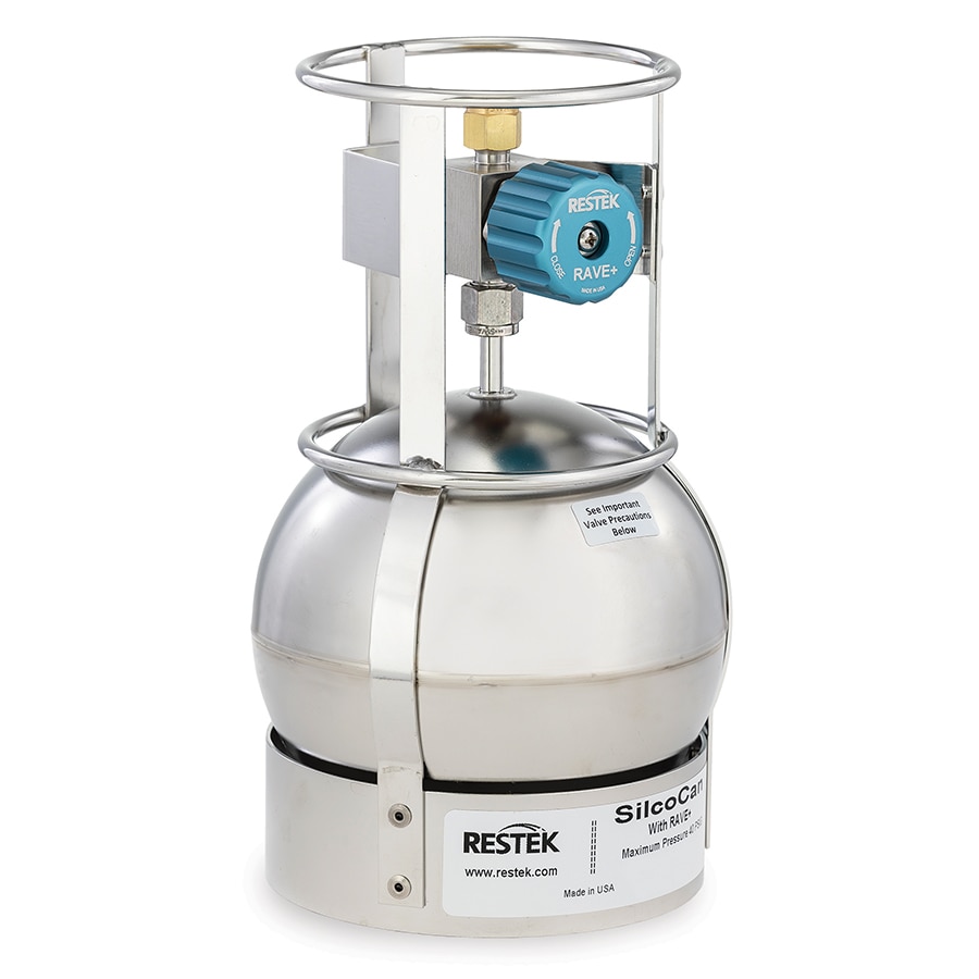 For ultimate inertness, SilcoCan air sampling canisters feature our unique Siltek treatment technology. Even highly active components at low parts-per-billion concentrations can be readily sampled and stored without loss. The valve is a high-quality, metal-to-metal seal, 2/3-turn valve with metal diaphragms to prevent sample adsorption for more accurate results. Both stainless-steel and Siltek-treated valves are available in both the 2-port and 3-port configurations. Each canister is slightly pressurized with contaminant-free nitrogen prior to shipment. Whether you are sampling for TO-14A, TO-15, TO-15A, or reactive sulfur compounds, SilcoCan canisters are your best choice for inertness. In Tedlar bags, the stability of low-level (100 ppbv) sulfur volatile organic compounds (VOCs) is poor, even within 24 hours of sampling. Sulfur compounds react with the metal surface in electropolished canisters, so they are unsuitable for collecting and storing low-level sulfur VOCs. SilcoCan air sampling canisters, which feature a Siltek-treated surface, offer excellent storage stability for sulfur VOCs at very low levels (5–20 ppbv), under dry or humid conditions. The versatility of the SilcoCan canister makes it an excellent choice for collecting and storing TO-14A, TO-15, or TO-15A compounds. Dimensions/Weights of Air Canisters