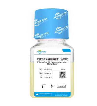 上海埃泽思生物冻存液产品货号:AC-1001049 一、产品简介 无血清细胞冻存液(治疗级)无糖是埃泽思生物(Applied Cell®)自主开发的一款无血清、无需程序降温的细胞冻存液,适用于多种哺乳动物细胞和间充质干细胞的冻存。该款冻存液内毒素水平远低于药典规定标准,适用于生产型细胞冻存;同时该款冻存液所有成分均为原料药级别,生产过程遵循 ISO9001 体系,严格执行 cGMP 操作标准,符合细胞治疗标准。