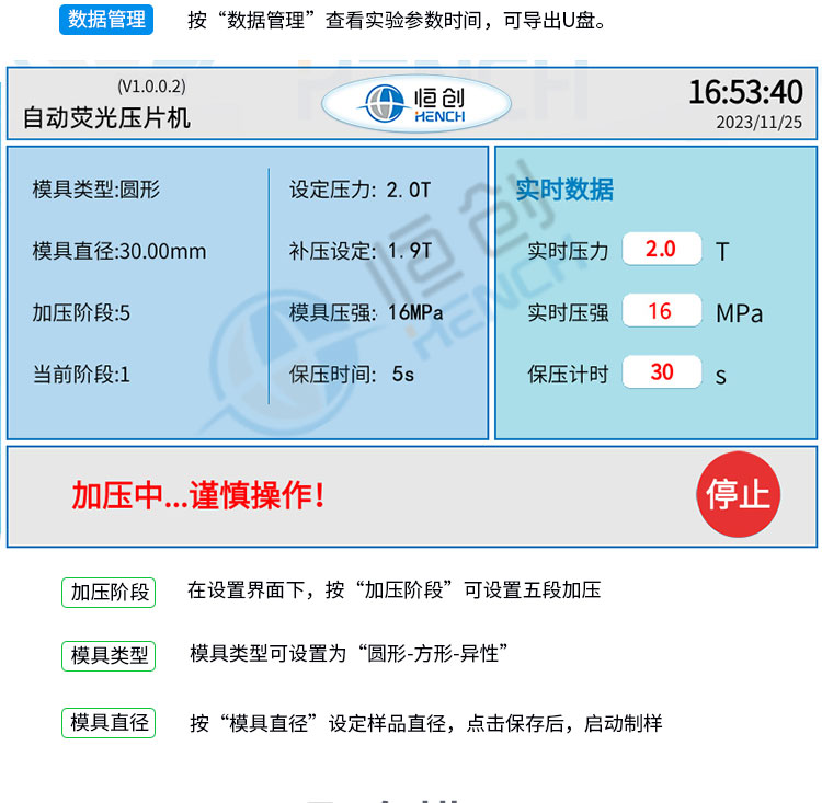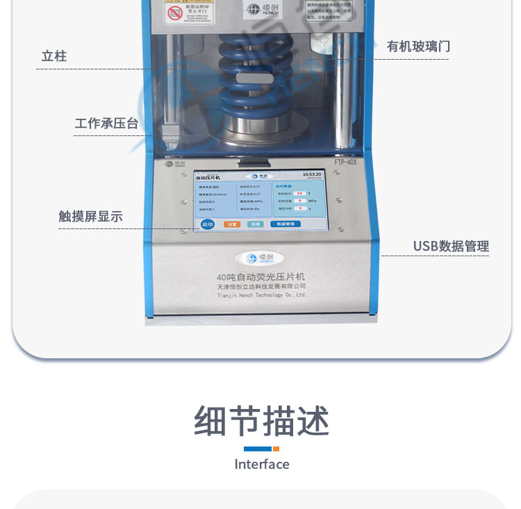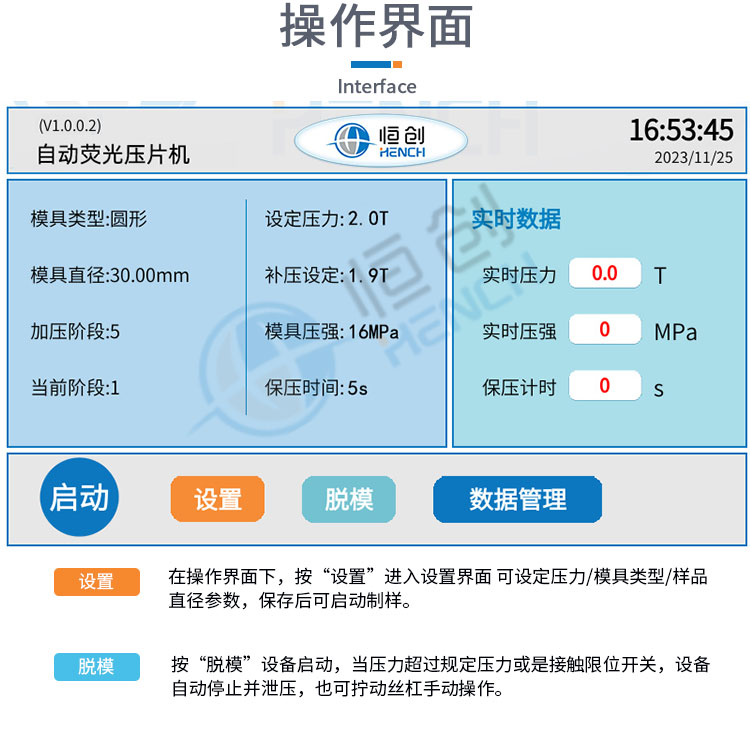 仪器型号 FTP-30X 压力范围 0.3-30T 活塞直径 Φ110mm 自动控制 采用Savta智能程序控制五段加压 加压方式 程序自动加压-自动补压-定时保压-自动泄压 模具规格 40-32mm(模具规格可定制) 保压时长 不限时(N秒) 压强换算 系统自动换算样品承受压强(超压提醒) 显示方式 7寸 触摸液晶显示屏/中英文界面可切换 模具材质 400C 高强度模具钢(淬火硬度85°) 设置方式 触摸屏操作方便、快捷 脱模压力 压力承载范围内可自行设置 脱模方式 按“脱模键”自动退膜 设备防护 10mm高强度氧化铝板+6mm有机玻璃门 油缸限位 油缸超过限位高度自动泄压 主机保护 程序压力,机械压力故障报错急停功能 实际压强超过本机最 大压强自动启动泄压程序 数据管理 可存储1万条历史操作记录,并可导出U盘 设备电源 220V(50Hz/60Hz)/可定制110V 设备功率 500W 油缸行程 ≤30mm 外形尺寸 260×390×465mm 设备重量 101Kg