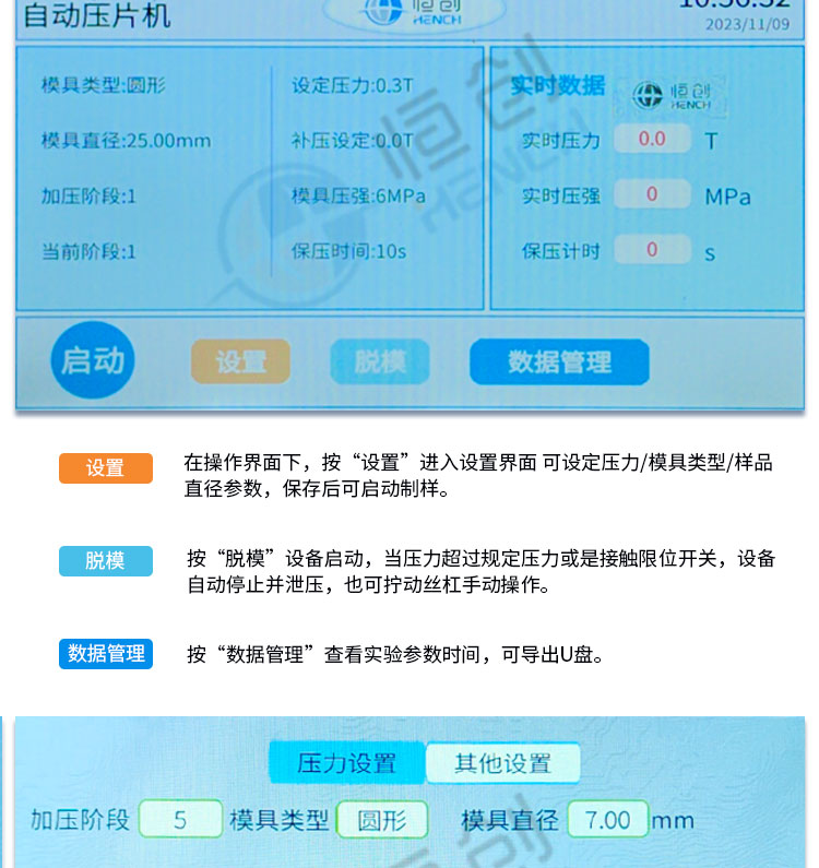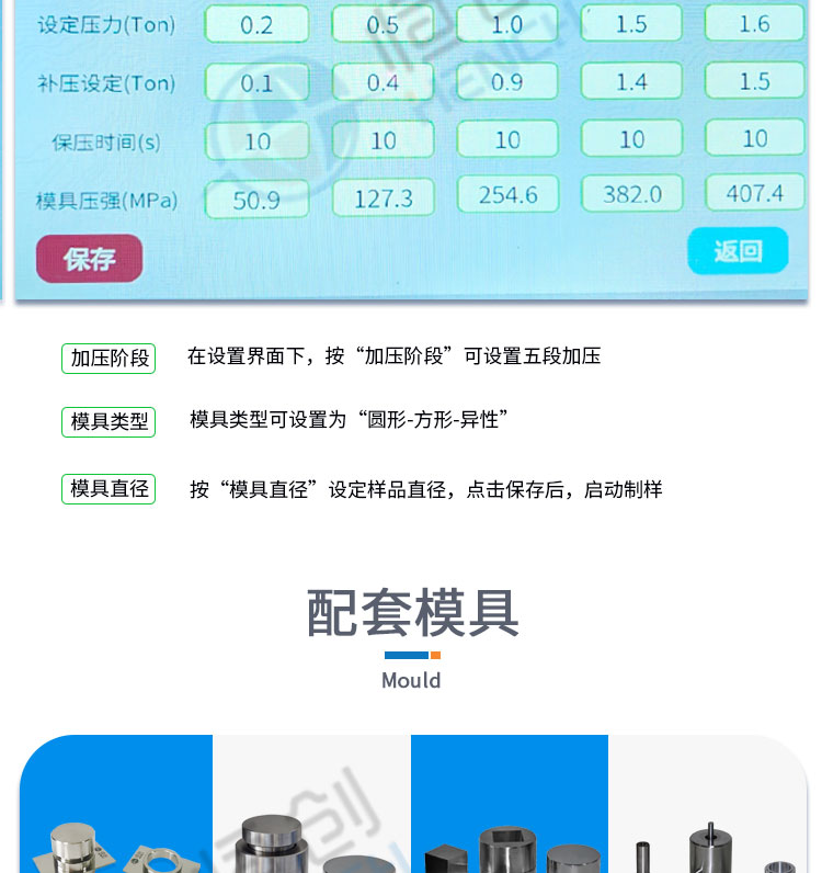 仪器型号 HAP-10S 压力范围 0.1-10T 油缸直径 Φ95mm 自动控制 采用Savta智能程序控制5段加压/可选配15段加压 加压方式 程序自动加压-自动补压-定时保压-自动泄压 保压时间 不限时(N秒) 压强换算 系统自动换算样品承受压强(超压提醒) 设备屏显 7寸 触摸液晶显示屏/中英文界面可切换 设备防护 10mm高强度氧化铝板+6mm有机玻璃防护门 限位保护 油缸超过限位高度自动泄压 主机保护 程序压力,机械压力故障报错急停功能 实际压强超过本机最 大压强自动启动泄压程序 数据管理 可存储1万条历史操作记录,并可导出U盘 油缸行程 ≤30mm 脱模压力 压力承载范围内可自行设置 被动安全 漏电保护+急停开关 智能操作 (选配)电脑连接进行远程操作/可根据客户需求定制 设备电源 220V(50Hz/60Hz)/可定制110V 设备功率 500W 有效空间 145×145×160mm 外形尺寸 230×395×432mm 设备重量 96Kg 配置说明 可根据用户需求定制或改进压片机,可选配承压范围内 各类圆形、方形、异形、电池模具等。