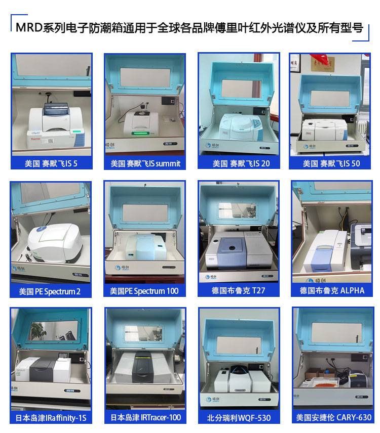 MRD系列智能红外光谱仪电子防潮箱是傅里叶红外光谱仪专用除湿装置可有效的保护 干涉仪,探测器因潮解造成的损坏。产品符合PC/JEDECJ-STD-033B作业标准(即湿 度不超过50RH%)产品可对湿度实时监测,超过设定湿度自动启动除湿功能,无需耗 材,低能耗, 目前产品销售遍及全国并远销海外***及地区,为全球傅里叶红外光谱仪 用户保驾护航。 产品特点: ▲ 控湿范围:25RH%— 50RH%,前置液晶屏 温度/湿度双显示 ▲ 显示范围:0RH% — 100RH%, 精度±3RH。 ▲ 开合方式:上盖阻尼合页开合设计有效的利用上部空间,避免对开门造成的空间浪 费及操作不便。 ▲ 支撑方式:采用液压杆悬停支撑。MRD-400采用液压杆悬停+单 独样品仓开合设计 ▲ 密封方式:气密式方式,仓门和箱体闭合处采用进口富集硅 胶密封条抗氧化仓内密 封效果好。 ▲ 线路设计:排线及供电线路隐藏保护设计,增加PCB电路板保护板。 ▲ 材质结构:防潮箱四周材料选用1.5mm轧钢板,底部采用5mm 特级载重板层表面 防静电阻燃喷涂工艺, 内部接合处固化胶填充确保密封性结构设计,密 封性能好。 ▲ 除湿系统:智能湿度感应模块模组(超强等级),采用可再生循 环吸潮分子层膜,微 电脑程控系统控湿, 仓内湿度超过设置湿度档位系统将智能启动除湿, 无耗 材,延长产品使用寿命。 ▲ 工作运行:断电具有吸湿防护功能, 仍可运用化学吸湿补位功能继续除湿24小时内湿 度上升幅度不超过10%。