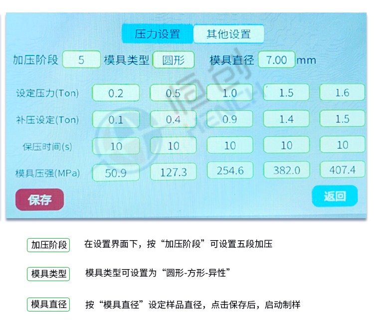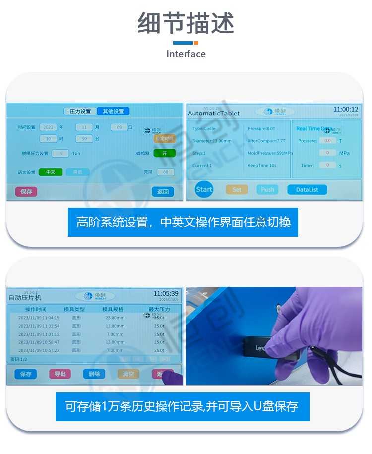 仪器型号 HAP-150FS 压力范围 3-150T 油缸直径 Φ250mm 自动控制 采用Savta智能程序控制5段加压/可选配15段加压 加压方式 程序自动加压-自动补压-定时保压-自动泄压 保压时间 不限时(N秒) 压强换算 系统自动换算样品承受压强(超压提醒) 设备屏显 7寸 触摸液晶显示屏/中英文界面可切换 设备防护 6.5mm高强度钢板+6mm有机玻璃防护门 限位保护 油缸超过限位高度自动泄压 主机保护 程序压力,机械压力故障报错急停功能 实际压强超过本机最 大压强自动启动泄压程序 数据管理 可存储1万条历史操作记录,并可导出U盘 油缸行程 ≤50mm 脱模压力 压力承载范围内可自行设置 被动安全 漏电保护+急停开关 智能操作 (选配)电脑连接进行远程操作/可根据客户需求定制 设备电源 220V(50Hz/60Hz)/可定制110V 设备功率 700W 有效空间 300×300×260mm 主机尺寸 420×600×925mm 主机重量 552Kg 控制箱尺寸 300×480×480mm 控制箱重量 85Kg 配置说明 可根据用户需求定制或改进压片机,可选配承压范围内 各类圆形、方形、异形、电池模具等。 补压设定 加压上限、补压值相差最 小0.3T,可根据要求来定制 最 小差值(<0.3T)