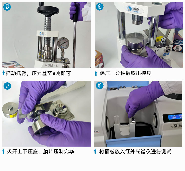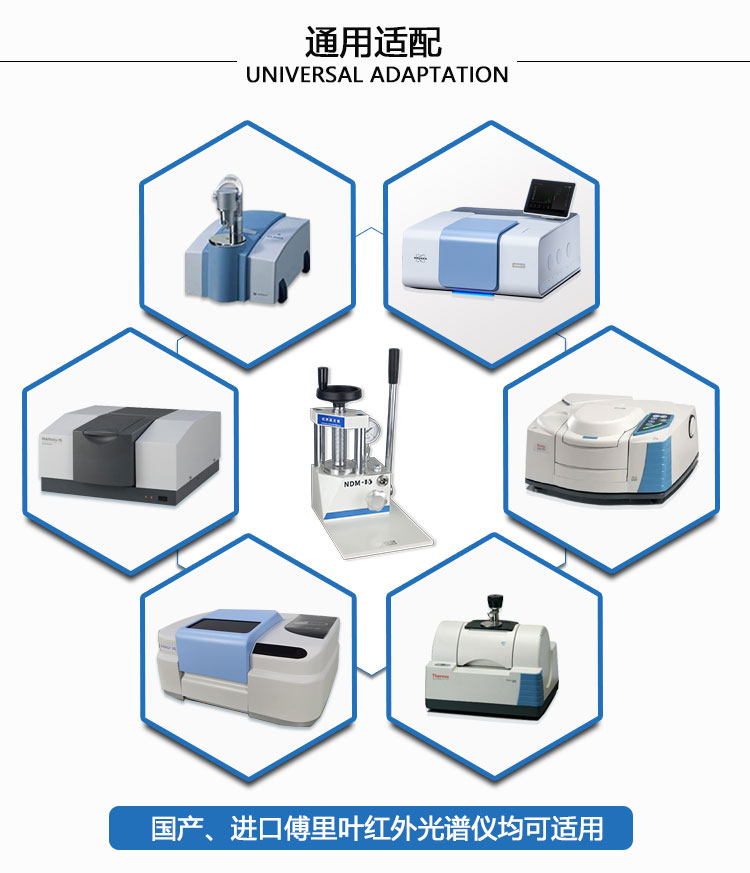 NDM-15红外压片机采用一体式结构,上压速度快,不漏油。 适用于红外光谱仪粉末样品压片,采用进口柱塞更大程度提高 产品的稳定性。可配套7mm,13mm红外压片模具。本产品 可配套所有品牌傅里叶变换红外光谱仪,例如:北分瑞利,天津 港东,美国Thermo,美国PE,德国布鲁克,日本岛津等。