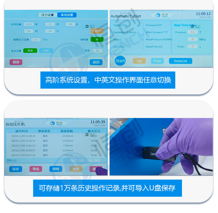 仪器型号 FTP-60X 压力范围 1-60T 活塞直径 Φ150mm 自动控制 采用Savta智能程序控制五段加压 加压方式 程序自动加压-自动补压-定时保压-自动泄压 模具规格 40-32mm(模具规格可定制) 保压时长 不限时(N秒) 压强换算 系统自动换算样品承受压强(超压提醒) 显示方式 7寸 触摸液晶显示屏/中英文界面可切换 模具材质 400C 高强度模具钢(淬火硬度85°) 设置方式 触摸屏操作方便、快捷 脱模压力 压力承载范围内可自行设置 脱模方式 按“脱模键”自动退膜 设备防护 10mm高强度氧化铝板+6mm有机玻璃门 油缸限位 油缸超过限位高度自动泄压 主机保护 程序压力,机械压力故障报错急停功能 实际压强超过本机最 大压强自动启动泄压程序 数据管理 可存储1万条历史操作记录,并可导出U盘 设备电源 220V(50Hz/60Hz)/可定制110V 设备功率 500W 油缸行程 ≤50mm 外形尺寸 300×520×585mm 设备重量 183Kg