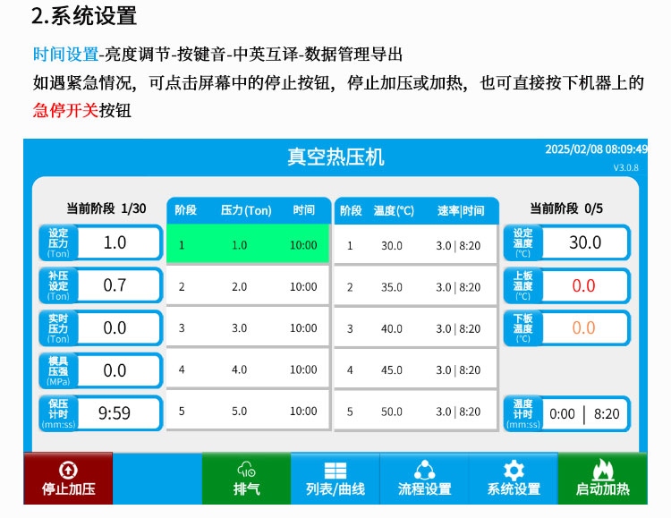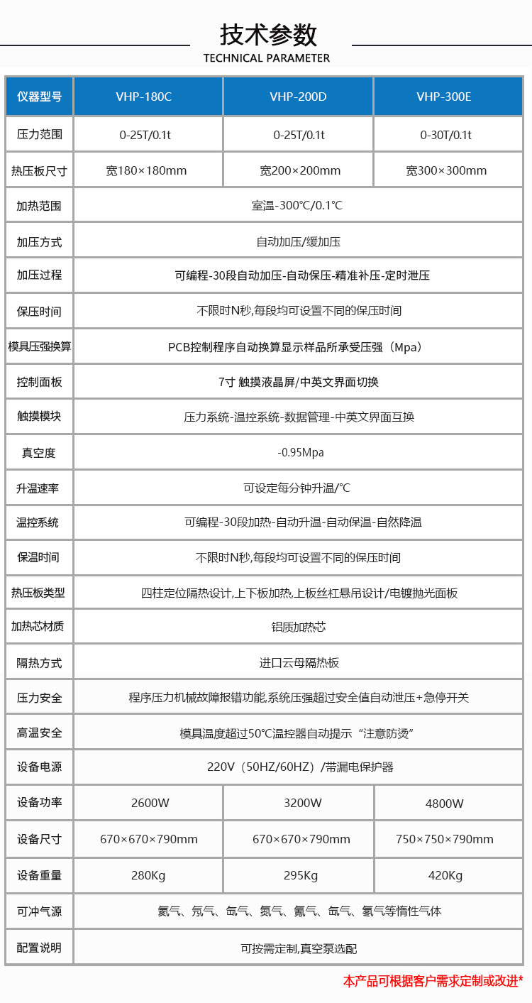 设备型号 VHP-300E 压力范围 0-30T/0.1t 热压板尺寸 300×300mm 加热范围 室温-300℃ 加压方式 自动加压 加压过程 自动加压-自动补压-精准补压-定时泄压 加压段数 30段可任意设置 保压时间 不限时N秒,每段均可设置不同的保压时间 压强换算 实时自动计算样品承受压强(Mpa) 控制面板 7寸 触摸液晶屏 触摸模块 压力/温控/数据管理系统-中英文切换 真空度 -0.095Mpa 升温速率 可设定每分钟升温/℃ 温控系统 可编程-30段加热-自动升温/保温 保温时间 不限时N秒,每段均可设置不同的保压时间 热压板类型 双平板加热、加压,上板固定/抛光面板 加热芯材质 铝芯 设备隔热 进口隔热板 压力安全 程序压力,机械压力故障报错急停功能 当系统压强超过安全值自动泄压+急停开关 高温安全 模具温度超过50℃温控器提示“注意防烫” 设备电源 220V(50Hz/60Hz)带漏电保护 设备功率 4800W(4500W主机+300W真空泵) 设备尺寸 750×750×790mm 真空泵尺寸 250×500×250mm 重量 420Kg 配置说明 按需定制/真空泵可选配