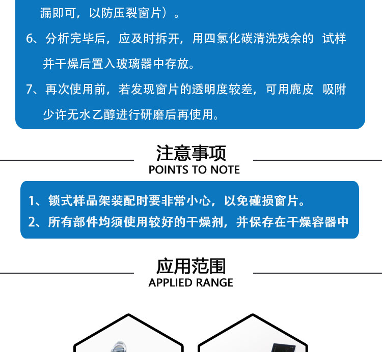 此款锁式样品架配套光程有:0.1mm、0.2mm、0.3mm、0.5mm。适用