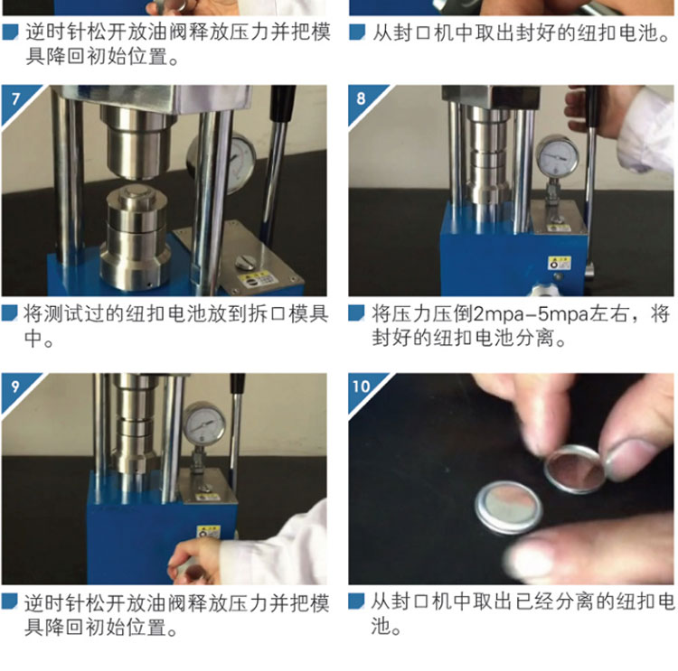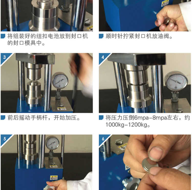 手动数显纽扣电池封口机,体积小重量轻,可放入手套箱操作。 适用于CR16、CR20、CR24、CR30电池壳使用。 仪器型号 YP-2NS 压力表显 数显表,精度0.01T,可切换兆帕(Mpa) 压力范围 0-2T(24.37Mpa) 活塞直径 Φ45mm 封口模具 标配CR20系列封口模具(可选配CR16/24/30) 封口压力 0.8~1.2T 拆口模具 可选配CR16/20/24/30系列封口模具 拆口压力 ≤0.4T 整体结构 手动液压制式,锻造工艺,一体式结构(搭载68号耐磨液压油) 立柱数量 2根 压力稳定性 ≤1Mpa/10min 外形尺寸 225×155×320mm 设备重量 28Kg 配置说明 直径≤Φ13的封口时,内面的填充电芯要比壳内空间≥0.2-0.3mm
