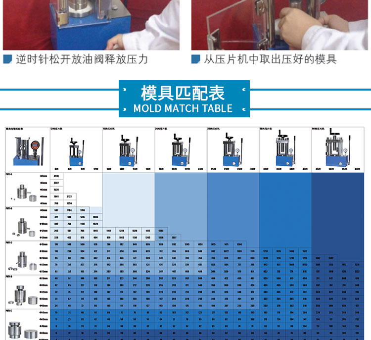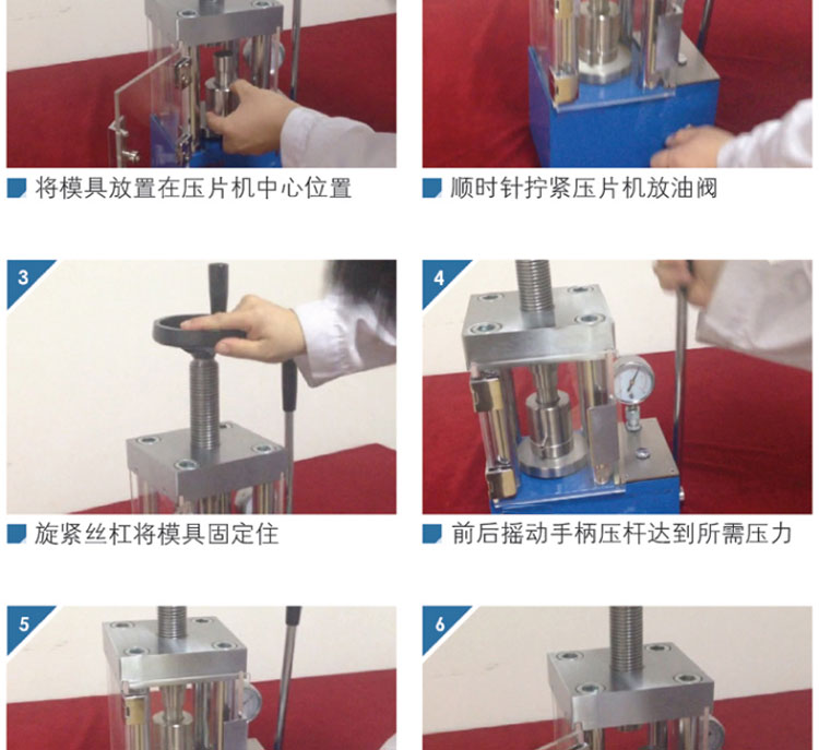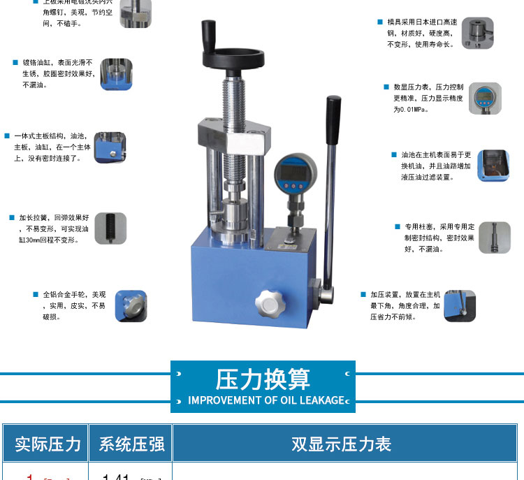 采用一体式结构,不掉压力、不漏油。适用于材料科学研究、催化实验 陶瓷烧结实验,水泥建材、药品研发制样等行业。 仪器型号 YP-24F 压力范围 0-24T(0-34.5Mpa) 油缸直径 95mm 压力换算 1Mpa=0.7T 压力表 压力吨位(T)/压强兆帕(Mpa)双刻度显示 活塞行程 30mm 设备防护 侧开5mm有机玻璃防护门,平移卡扣门锁安全便捷 压力稳定性 ≤1Mpa/10min 工作台直径 Φ105mm 立柱数量 4根 有效空间 112×112×160mm 外形尺寸 305×195×430mm 设备重量 66Kg 整体结构 手动液压制式,锻造工艺,一体式结构(搭载68号耐磨液压油) 配置说明 根据客户需求加高立柱,可选配承压范围内各类圆形,方形,异形, 电池模具等