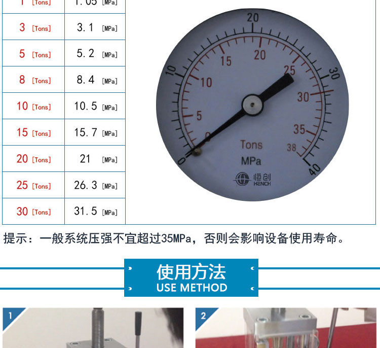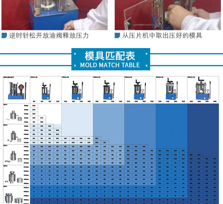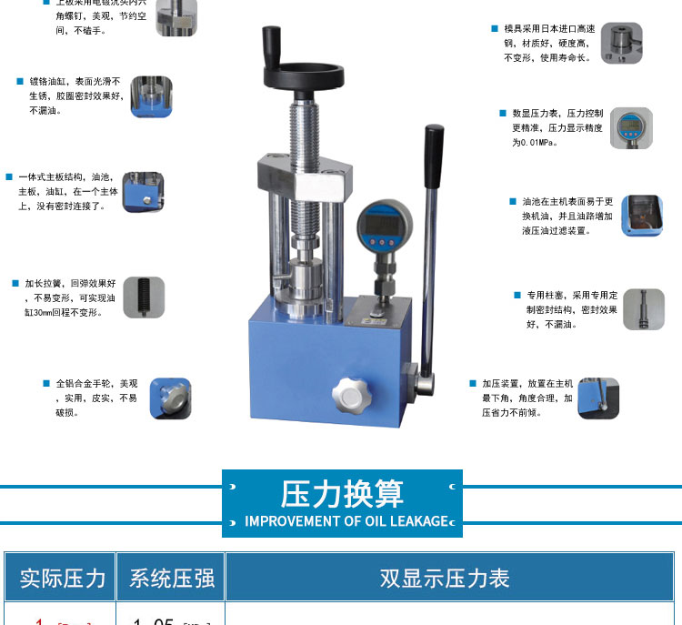 采用一体式结构,不掉压力、不漏油。适用于材料科学研究、催化实验 陶瓷烧结实验,水泥建材、药品研发制样等行业。 仪器型号 YP-30F 压力范围 0-30T(0-32Mpa) 油缸直径 110mm 压力换算 1Mpa=0.95T 压力表 压力吨位(T)/压强兆帕(Mpa)双刻度显示 活塞行程 30mm 设备防护 侧开5mm有机玻璃防护门,平移卡扣门锁安全便捷 压力稳定性 ≤1Mpa/10min 工作台直径 Φ120mm 立柱数量 4根 有效空间 112×112×160mm 外形尺寸 305×195×430mm 设备重量 66Kg 整体结构 手动液压制式,锻造工艺,一体式结构(搭载68号耐磨液压油) 配置说明 根据客户需求加高立柱,可选配承压范围内各类圆形,方形,异形, 电池模具等