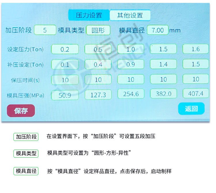 自动等静压压片机适合对样品成型均匀度要求比较严格的用户,可压制 一些钢模无法成型的样品,采用程序加压、保压、泄压方式,制样速度快 精度高,广泛应用于粉末冶金,复合材料,耐火材料,陶瓷硬度合金的成型。 仪器型号 HAP-65FJ 压力范围 1-65T 油缸直径 160mm 油缸行程 ≤50mm 腔体尺寸 Φ50×150mm 腔体材质 3铬13# 模具钢 环境温度 9℃-42℃ 最 大压强 ≤300Mpa(可定制500Mpa) 加压方式 电动加压 加压过程 波段加压-自动精准补压-波段保压-定时泄压 加压段数 5段加压任意设置 保压时间 不限时(N秒)每段可设置不同的保压时间 显示方式 7寸触摸液晶屏/中英文界面可切换 设置方式 触摸直接修改设定数值(方便、快捷) 压强换算 程序自动换算/并直接显示样品所承受压强(Mpa) 限位保护 油缸超过限位高度自动泄压 主动安全 程序压力,机械压力故障报错急停功能 实际压强超过本机最 大压强自动启动泄压程序 被动安全 漏电保护+急停开关+钢板防护+有机玻璃防护 数据管理 可存储1万条历史操作记录,并可导出U盘 智能操作 电脑连接进行远程操作(选配)/可根据客户需求定制 设备功率 500W 设备电源 220V(50Hz/60Hz)/可定制110V 主机尺寸 330×400×935mm 控制箱尺寸 400×280×400mm 设备重量 385Kg 配置说明 可根据需求定制改进等静压机或橡胶模具