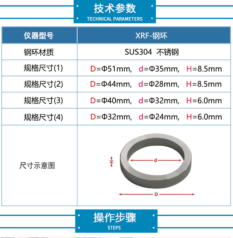 型 号 | | 钢环材质 | SUS304 不锈钢 | 规格尺寸(1) | D=Φ51mm, d=Φ35mm, H=8.5mm | 规格尺寸(2) | D=Φ44mm, d=Φ28mm, H=8.5mm | 规格尺寸(3) | D=Φ40mm, d=Φ32mm, H=6.0mm | 规格尺寸(4) | D=Φ32mm, d=Φ24mm, H=6.0mm |
