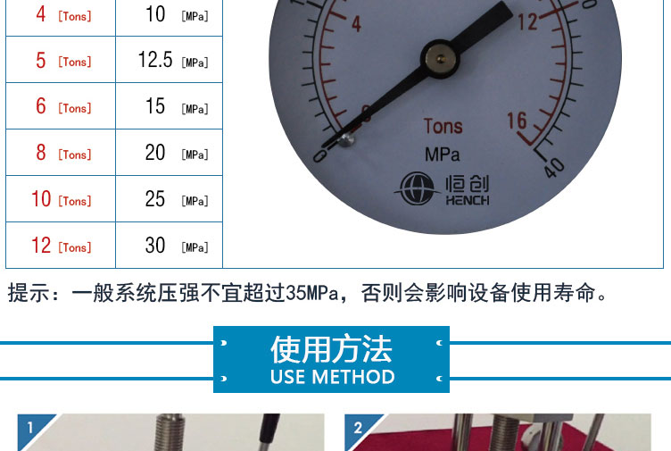 采用一体式结构,不掉压力,不漏油。适用于材料科学研究、催化实验 陶瓷烧结实验、水泥建材、药品研发制样等行业。 仪器型号 YP-12 安全量程 0-12T(0-30Mpa) 压力表最 大量程 0-20T(0-40Mpa) 油缸直径 70mm 压力表 压力吨位(T)/压强兆帕(Mpa)双刻度显示 活塞行程 32mm 压力稳定性 ≤1Mpa/10min 工作台直径 Φ80mm 立柱数量 2根 有效空间 95×130mm 外形尺寸 230×160×385mm 设备重量 28Kg 整体结构 手动液压制式,锻造工艺,一体式结构(搭载68号耐磨液压油) 配置说明 根据客户需求加高立柱,可选配承压范围内各类圆形,方形,异形, 电池模具等