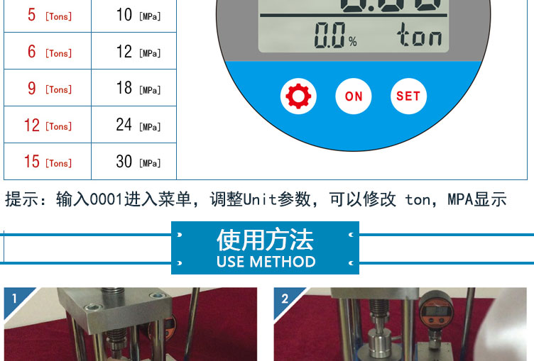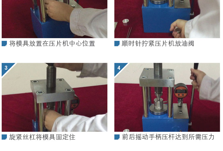 采用一体式结构,不掉压力,不漏油。适用于材料科学研究、催化实验 陶瓷烧结实验,水泥建材、药品研发制样等行业 仪器型号 YP-15RS 压力范围 0-15T(0-30.5Mpa) 油缸直径 80mm 压力换算 1Mpa=0.5T 压力表 DDNT高精度数字传感,吨位显示(T)可切换 兆帕(Mpa),精度0.01T 活塞行程 30mm 压力稳定性 ≤1Mpa/10min 工作台直径 Φ90mm 立柱数量 4根 有效空间 80×80×150mm 外形尺寸 250×180×425mm 设备重量 42.5Kg 整体结构 手动液压制式,锻造工艺,一体式结构 (搭载68号耐磨液压油) 配置说明 根据客户需求加高立柱,可选配承压范围内各类圆形 方形,异形,电池模具等。