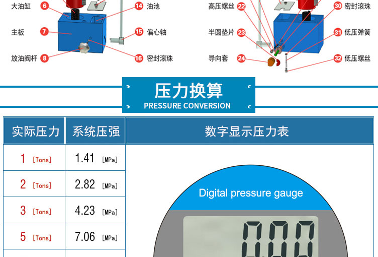 采用一体式结构,不掉压力,不漏油。适用于材料科学研究、催化实验 陶瓷烧结实验,水泥建材、药品研发制样等行业 仪器型号 YP-24S 压力范围 0-24T(0-34.5Mpa) 油缸直径 95mm 压力换算 1Mpa=0.7T 压力表 DDNT高精度数字传感,吨位显示(T)可切换 兆帕(Mpa),精度0.01T 活塞行程 30mm 压力稳定性 ≤1Mpa/10min 工作台直径 Φ105mm 立柱数量 4根 有效空间 80×80×150mm 外形尺寸 250×180×425mm 设备重量 42.5Kg 整体结构 手动液压制式,锻造工艺,一体式结构 (搭载68号耐磨液压油) 配置说明 根据客户需求加高立柱,可选配承压范围内各类圆形 方形,异形,电池模具等。