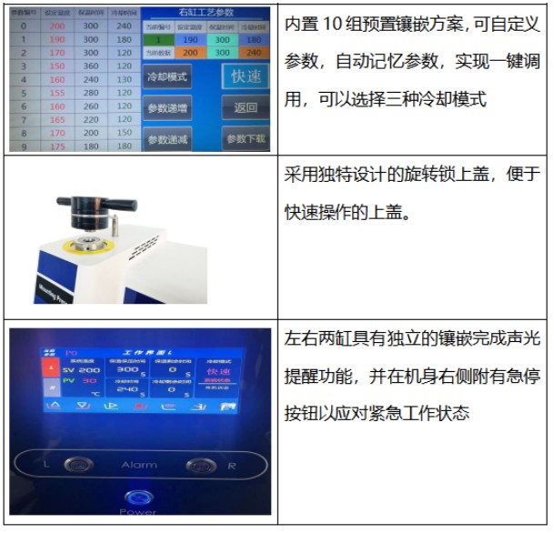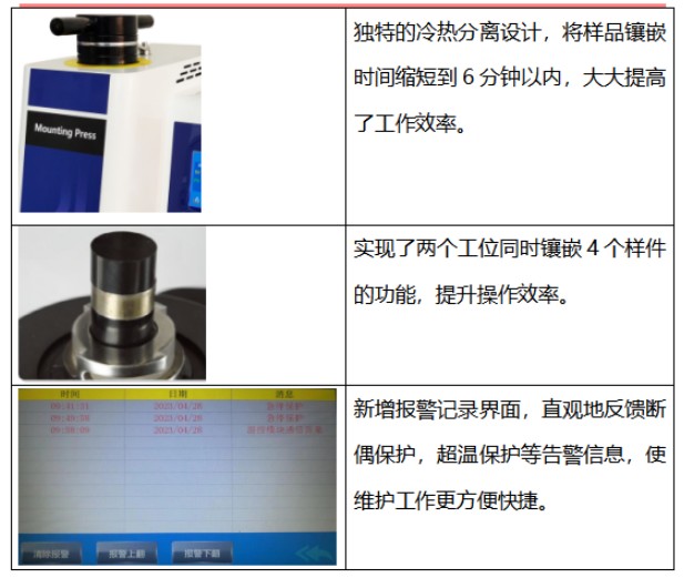一、产品介绍 ZXQ-3Y型自动镶嵌机是一款先进的双工位液压水冷式自动试样镶嵌设备,可一次性镶嵌4个试样,极大地提高了制样效率。独特的冷热分离设计,将样品镶嵌时间缩短到6分钟以内,大大提高了工作效率,镶嵌过程由全自动程序进行控制,实现了加热、加压、保压、冷却、卸压等镶嵌过程的一键式操作,无需操作人员值守,自动完成试样镶嵌。该机采用自主研发的低噪音液压站加压,保压,镶嵌样品表面光亮如镜,制样成功率高。高清触摸屏显示及控制,实时显示温度和系统状态,镶嵌方案可保存,调取方便;配备强制水冷却系统,制样速度快,采用独特设计的旋转锁上盖,安全性更高,操作更方便,性能稳定,是试样镶嵌的理想设备。 二、主要参数