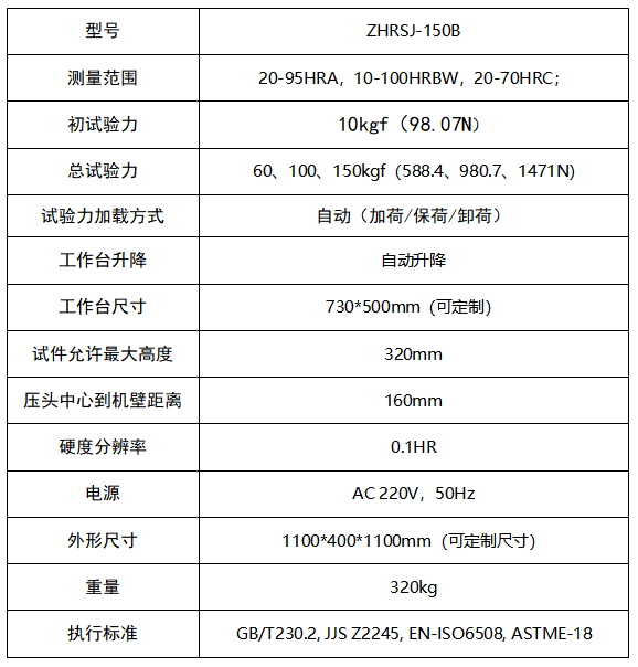 1.采用8寸触摸屏和高速ARM处理器,显示直观,人机互动友好,操作简便; 2.运算速度快,数据库广量存储,数据自动修正,并提供数据折线报表; 3.不论工件大小,所处位置,试样离压头远近,工作台可自动升降,自动加载,自动测量工件的洛氏硬度; 4.大型工作台730*500mm(可定制),可平稳测试大型工件; 5.双轴联动同步升降结构,升降平稳; 6.带有温度测量功能,数字化测温电路,长期工作,稳定可靠; 7.可设置硬度值的最大值和最小值,当测试值超过设定范围时,发出报警音; 8.具有软件硬度值修正功能,可以在一定范围内直接对硬度值进行修正; 9.可自动进行全硬度标尺的单位转换; 10.配置无线蓝牙打印机,并可通过RS232、USB(可选装)端口输出数据; 11.精度符合GB/T230.2、ISO6508-2和美国ASTM E18标准。 技术参数: