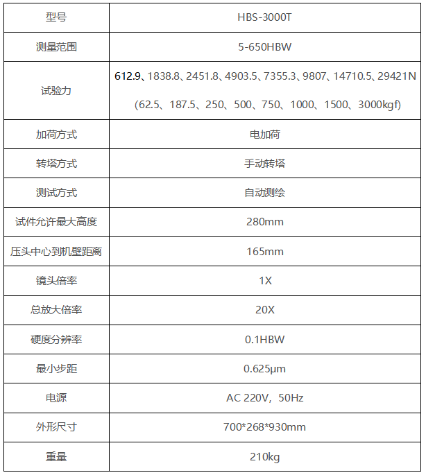 1、机身使用优质铸铁一次浇铸成型,配合以汽车烤漆处理工艺,外形圆润美观; 2、便捷控制系统,可自动进行全硬度标尺的单位转换; 3、通过砝码施加试验力,完全实现了加荷、保荷、卸荷的自动化运行; 4、可设置硬度值的最大值和最小值,当测试值超过设定范围时,发出报警音; 5、具有软件硬度值修正功能,可以在一定范围内直接对硬度值进行修正; 6、具有数据库功能,对试验数据自动进行分组保存,每组可保存10个数据,可以保存2000个以上数据; 7、具有硬度值曲线显示功能,直观显示硬度值的变化; 8、配置无线蓝牙打印机,并可通过RS232、USB(可选装)接口输出数据; 9、可选配CCD图像处理系统或视频测量装置; 10、精度符合精度符合GB/T231.2、ISO 6506-2和美国ASTM E10标准。 应用范围 1、测定黑色金属、有色金属及轴承合金材料的布氏硬度; 2、硬质合金、渗碳钢、淬火钢、表面淬火钢、硬铸钢、铝合金、铜合金、可锻铸件、软钢、调质钢、退火钢、轴承钢等。 技术参数