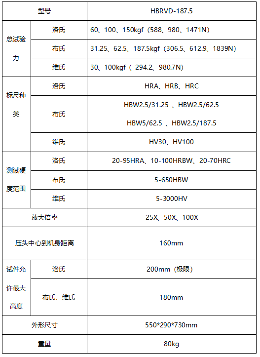 1、采用8寸触摸屏和高速ARM处理器,显示直观,人机互动友好,操作简便; 2、机身使用优等铸铁一次浇铸成型,配合以汽车烤漆处理工艺,外形圆润美观; 3、测量装置采用光栅位移传感器,通过液晶屏显示结果,并可显示与设置测试标尺、试验力、压头类型、保荷时间、换算单位等; 4、具备了布氏、洛氏、维氏三种试验方法,多级试验力,能满足多种硬度测试要求; 5、电子闭环控制施加试验力,完全实现了试验力的自动加荷、保荷、卸荷的自动化运作; 6、高清测量和观察-双物镜组合,结合内置长度编码器的高清测微目镜,实现了压痕对角线的一键测量,大大地减少了人为操作干扰与读数误差; 7、内置测试软件可对机器硬度值进行修正; 8、便捷控制系统,可自动进行全硬度标尺的单位转换; 9、内置打印机,并可通过RS232端口输出数据。 应用范围 1、测定黑色金属、有色金属及硬质合金的布氏、维氏、洛氏硬度; 2、铸件、退火钢、正火钢、有色金属及软合金的布氏硬度; 3、淬火、调质等热处理材料的洛氏硬度; 4、渗氮层、陶瓷、薄板、金属薄片、电镀层、微小零件的维氏硬度。 技术参数