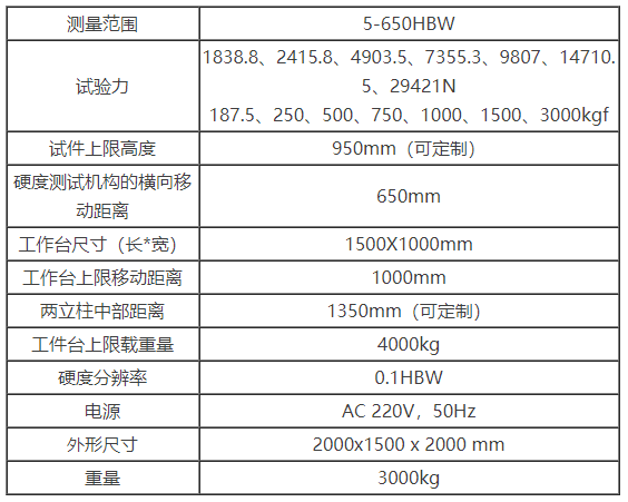 1、机身及工作台采用精 密铸造工艺,构造坚固、刚性好、准确、可靠、耐用; 2、门式机架,大型可移动工作台,上限移动距离1000mm; 3、精 密的工件定位装置,满足试验点的准确定位; 4、预处理铣削动作自动完成,去除表面干扰,铣削深 度一致,深 度可调; 5、加载装置内置精 密压力传感器,试验力值准确、稳定可靠,并具备试验力自动补偿功能; 6、采用自主研发的数显门式电子布氏硬度计专用数控系统,运行速度快,全闭环式由快到慢梯度施加试验力,确保了试验力施加平稳无冲击; 7、试验力、加载保荷时间、进给速度、测试速度可人为调整控制; 8、在线全过程具有多处传感器,自动完成工件的进出和硬度试验,无需值守; 9、自动化测量,肖除人为操作干扰与读数误差; 10、配备布氏CCD图像自动测量系统,图像处理模块可对压痕进行封闭式抓拍,自动显示布氏硬度值完成硬度测试; 11、单位换算,保存测试数据组并自动生成硬度测试报告及报表。测试数据保存于离线数据库中,方便随时调用; 12、精度符合GB/T231.2、ISO 6506-2和美国ASTM E10标准。 应用范围 1、测定铸铁、有色金属、各种退火、调质处理以后以及大多数出厂供货的钢材; 2、适合测试较软的金属如纯铝、铜、铅锡锌等及其合金。 技术参数