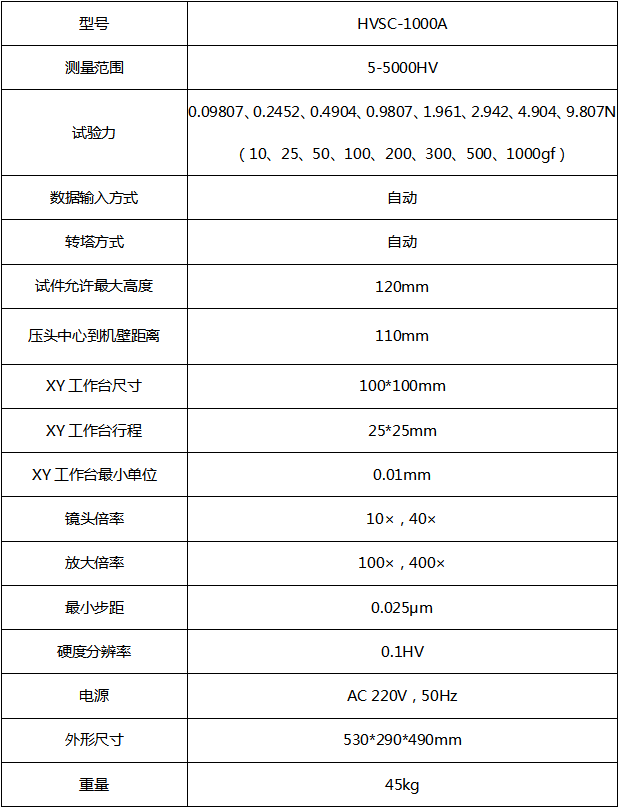 1、通过液晶屏显示结果,并可显示与设置测试标尺、试验力、压头类型、保荷时间、换算单位等; 2、机身使用优质铸铁一次浇铸成型,配合以汽车烤漆处理工艺,外形圆润美观; 3、涡轮蜗杆升降系统大大的提高测试稳定性以及测试精度,测试完成后无需再次对焦; 4、配置了自动转塔功能,高清测量和观察-双物镜组合,结合内置长度编码器的高清测微目镜,实现了压痕对角线的一键测量,大大地减少了人为操作干扰与读数误差; 5、便捷数控系统,可自动进行全硬度标尺的单位转换; 6、在屏幕上能显示试验方法、试验力、压痕长度、保荷时间、转换标尺,操作时只要测量压痕按目镜编码器按钮,即可自动计算出硬度值并显示在屏幕上,数据结果可通过打印机输出; 7、可选配CCD图像处理系统,另可选配努氏压头,进行努氏硬度测量; 8、配置无线蓝牙打印机,并可通过RS232、USB接口输出数据。 应用范围 1、 黑色金属、有色金属、IC薄片,表面涂层、层压金属; 2、 玻璃、陶瓷、玛瑙、宝石、薄塑料等; 3、 碳化层和淬火层的深度及梯度的硬度测试。 4、适用于平行平面和微小零件及超薄零件的精密显微维氏硬度测量。 技术参数