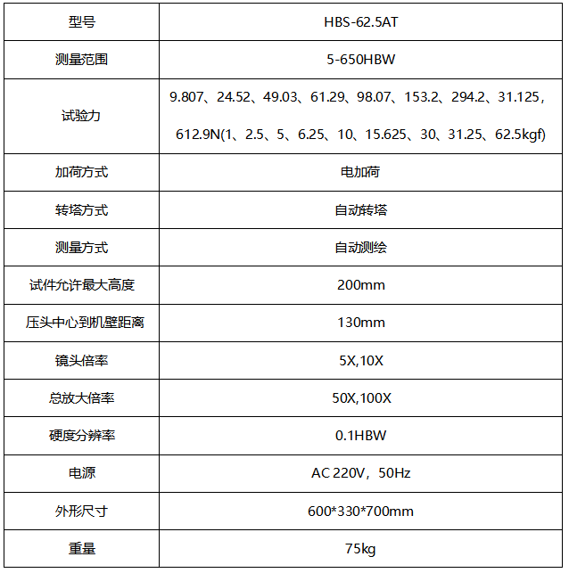 1、机身使用优质铸铁一次浇铸成型,配合以汽车烤漆处理工艺,外形圆润美观; 2、配置自动转塔功能,压头和镜头之间自动切换,使用更加方便; 3、便捷控制系统,可自动进行全硬度标尺的单位转换; 4、电子闭环控制施加试验力,完全实现了试验力的加荷、保荷、卸荷的自动化运行; 5、可设置硬度值的最大值和最小值,当测试值超过设定范围时,发出报警音; 6、具有软件硬度值修正功能,可以在一定范围内直接对硬度值进行修正; 7、具有数据库功能,对试验数据自动进行分组保存,每组可保存10个数据,可以保存2000个以上数据; 8、具有硬度值曲线显示功能,直观显示硬度值的变化; 9、配置无线蓝牙打印机,并可通过RS232、USB(可选装)接口输出数据; 10、可选配CCD图像处理系统或视频测量装置; 11、精度符合GB/T231.2、ISO6506-2和美国ASTM E10标准。 应用范围 1、测定黑色金属,有色金属及轴承合金材料的布氏硬度; 2、应用范围广,尤其适用于软金属材料及小型零部件的布氏硬度试验。 技术参数